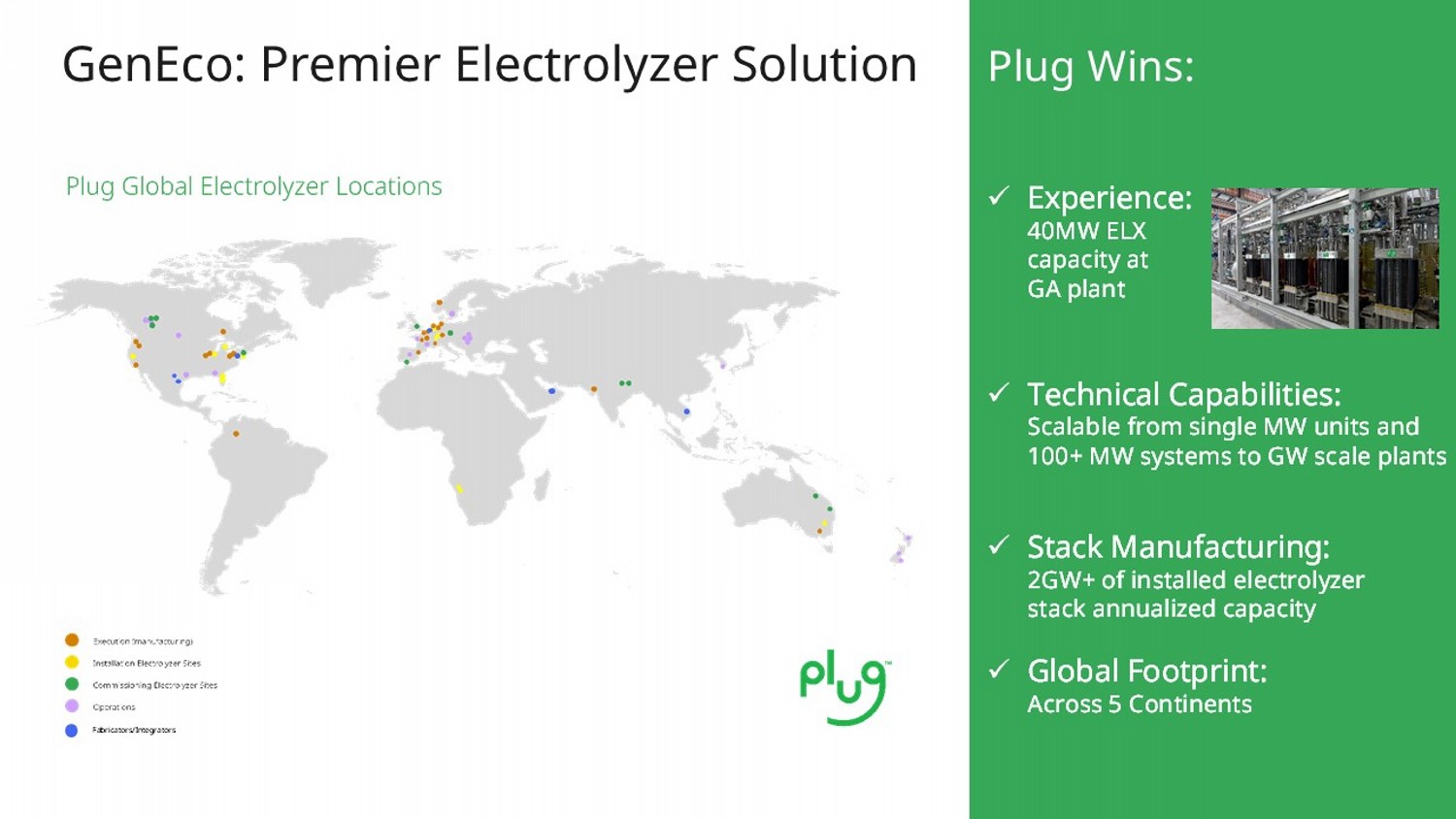 5 5 GenEco : Premier Electrolyzer Solution Plug Wins: x Experience: 40MW ELX capacity at GA plant x Technical Capabilities: Scalable from single MW units and 100+ MW systems to GW scale plants x Stack Manufacturing: 2GW+ of installed electrolyzer stack annualized capacity x Global Footprint: Across 5 Continents Fabricators/Integrators