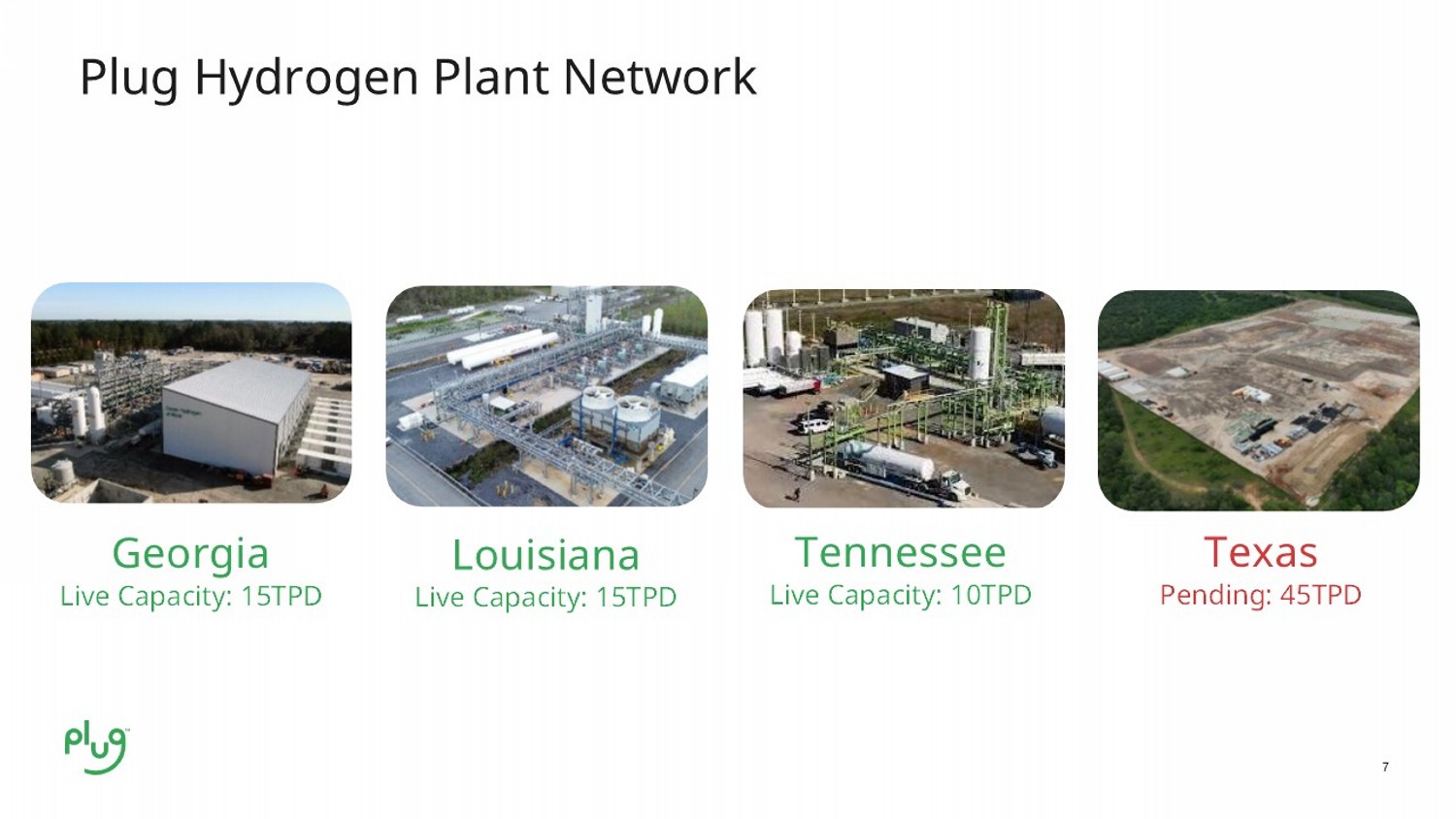 7 Plug Hydrogen Plant Network Georgia Live Capacity: 15TPD Louisiana Live Capacity: 15TPD Tennessee Live Capacity: 10TPD Texas Pending: 45TPD