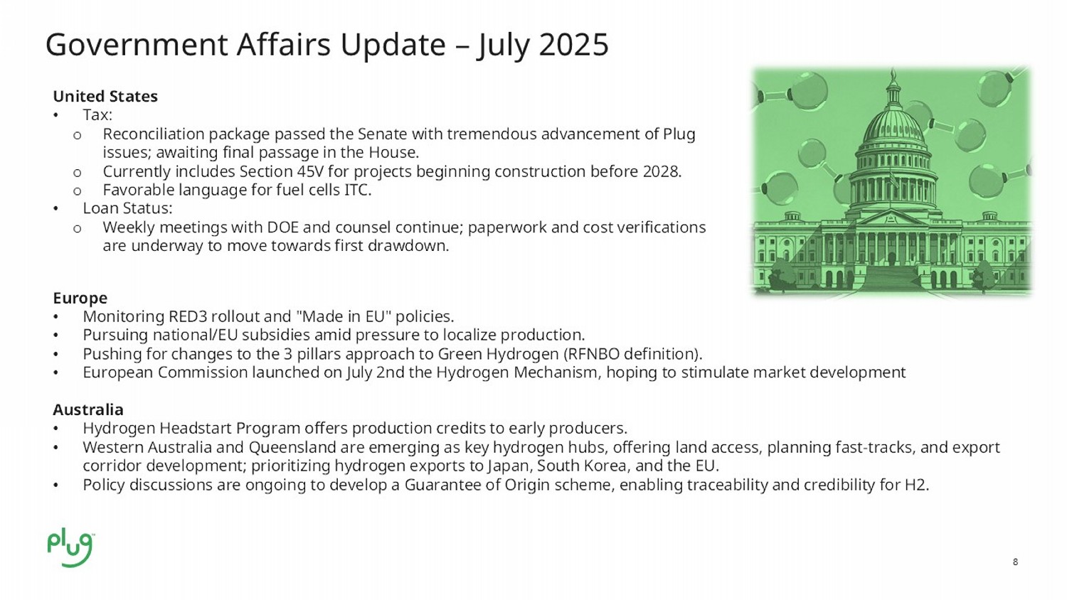 8 Government Affairs Update – July 2025 United States • Tax: o Reconciliation package passed the Senate with tremendous advancement of Plug issues; awaiting final passage in the House. o Currently includes Section 45V for projects beginning construction before 2028. o Favorable language for fuel cells ITC. • Loan Status: o Weekly meetings with DOE and counsel continue; paperwork and cost verifications are underway to move towards first drawdown. Europe • Monitoring RED3 rollout and "Made in EU" policies. • Pursuing national/EU subsidies amid pressure to localize production.​ • Pushing for changes to the 3 pillars approach to Green Hydrogen (RFNBO definition). • European Commission launched on July 2nd the Hydrogen Mechanism, hoping to stimulate market development Australia • Hydrogen Headstart Program offers production credits to early producers. • Western Australia and Queensland are emerging as key hydrogen hubs, offering land access, planning fast - tracks, and export corridor development; prioritizing hydrogen exports to Japan, South Korea, and the EU. • Policy discussions are ongoing to develop a Guarantee of Origin scheme, enabling traceability and credibility for H2.