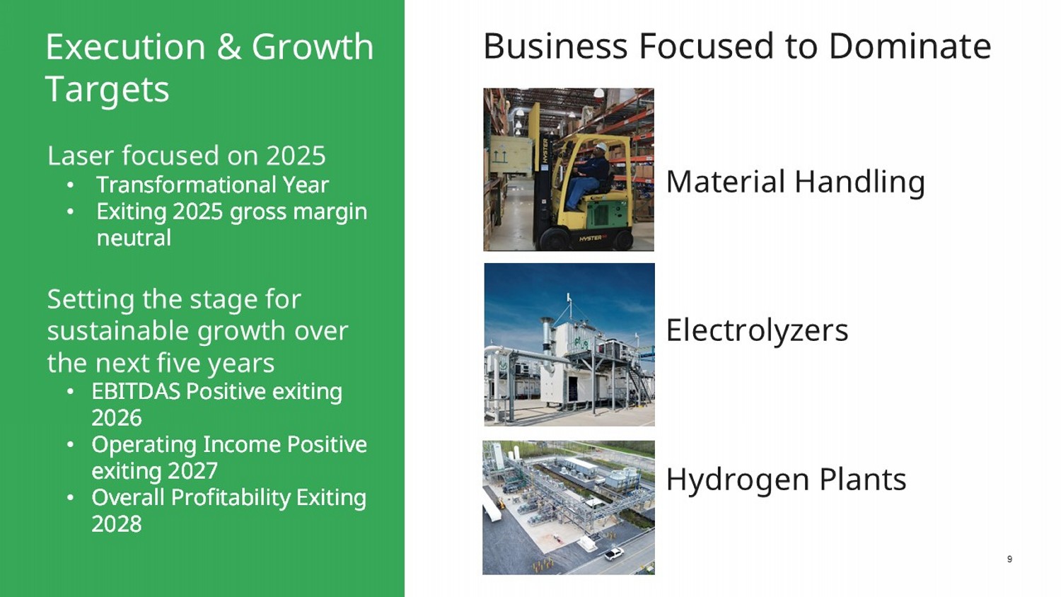 9 Laser focused on 2025 • Transformational Year • Exiting 2025 gross margin neutral Setting the stage for sustainable growth over the next five years • EBITDAS Positive exiting 2026 • Operating Income Positive exiting 2027 • Overall Profitability Exiting 2028 Execution & Growth Targets Material Handling Electrolyzers Hydrogen Plants Business Focused to Dominate