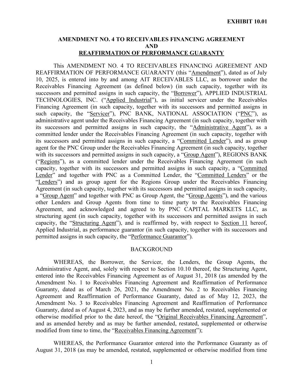 EXHIBIT 10.01 1 AMENDMENT NO. 4 TO RECEIVABLES FINANCING AGREEMENT AND REAFFIRMATION OF PERFORMANCE GUARANTY This AMENDMENT NO. 4 TO RECEIVABLES FINANCING AGREEMENT AND REAFFIRMATION OF PERFORMANCE GUARANTY (this “Amendment”), dated as of July 10, 2025, is entered into by and among AIT RECEIVABLES LLC, as borrower under the Receivables Financing Agreement (as defined below) (in such capacity, together with its successors and permitted assigns in such capacity, the “Borrower”), APPLIED INDUSTRIAL TECHNOLOGIES, INC. (“Applied Industrial”), as initial servicer under the Receivables Financing Agreement (in such capacity, together with its successors and permitted assigns in such capacity, the “Servicer”), PNC BANK, NATIONAL ASSOCIATION (“PNC”), as administrative agent under the Receivables Financing Agreement (in such capacity, together with its successors and permitted assigns in such capacity, the “Administrative Agent”), as a committed lender under the Receivables Financing Agreement (in such capacity, together with its successors and permitted assigns in such capacity, a “Committed Lender”), and as group agent for the PNC Group under the Receivables Financing Agreement (in such capacity, together with its successors and permitted assigns in such capacity, a “Group Agent”), REGIONS BANK (“Regions”), as a committed lender under the Receivables Financing Agreement (in such capacity, together with its successors and permitted assigns in such capacity, a “Committed Lender” and together with PNC as a Committed Lender, the “Committed Lenders” or the “Lenders”) and as group agent for the Regions Group under the Receivables Financing Agreement (in such capacity, together with its successors and permitted assigns in such capacity, a “Group Agent” and together with PNC as Group Agent, the “Group Agents”), and the various other Lenders and Group Agents from time to time party to the Receivables Financing Agreement, and acknowledged and agreed to by PNC CAPITAL MARKETS LLC, as structuring agent (in such capacity, together with its successors and permitted assigns in such capacity, the “Structuring Agent”), and is reaffirmed by, with respect to Section 11 hereof, Applied Industrial, as performance guarantor (in such capacity, together with its successors and permitted assigns in such capacity, the “Performance Guarantor”). BACKGROUND WHEREAS, the Borrower, the Servicer, the Lenders, the Group Agents, the Administrative Agent, and, solely with respect to Section 10.10 thereof, the Structuring Agent, entered into the Receivables Financing Agreement as of August 31, 2018 (as amended by the Amendment No. 1 to Receivables Financing Agreement and Reaffirmation of Performance Guaranty, dated as of March 26, 2021, the Amendment No. 2 to Receivables Financing Agreement and Reaffirmation of Performance Guaranty, dated as of May 12, 2023, the Amendment No. 3 to Receivables Financing Agreement and Reaffirmation of Performance Guaranty, dated as of August 4, 2023, and as may be further amended, restated, supplemented or otherwise modified prior to the date hereof, the “Original Receivables Financing Agreement”, and as amended hereby and as may be further amended, restated, supplemented or otherwise modified from time to time, the “Receivables Financing Agreement”); WHEREAS, the Performance Guarantor entered into the Performance Guaranty as of August 31, 2018 (as may be amended, restated, supplemented or otherwise modified from time