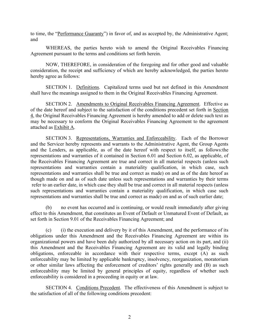 2 to time, the “Performance Guaranty”) in favor of, and as accepted by, the Administrative Agent; and WHEREAS, the parties hereto wish to amend the Original Receivables Financing Agreement pursuant to the terms and conditions set forth herein. NOW, THEREFORE, in consideration of the foregoing and for other good and valuable consideration, the receipt and sufficiency of which are hereby acknowledged, the parties hereto hereby agree as follows: SECTION 1. Definitions. Capitalized terms used but not defined in this Amendment shall have the meanings assigned to them in the Original Receivables Financing Agreement. SECTION 2. Amendments to Original Receivables Financing Agreement. Effective as of the date hereof and subject to the satisfaction of the conditions precedent set forth in Section 4, the Original Receivables Financing Agreement is hereby amended to add or delete such text as may be necessary to conform the Original Receivables Financing Agreement to the agreement attached as Exhibit A. SECTION 3. Representations, Warranties and Enforceability. Each of the Borrower and the Servicer hereby represents and warrants to the Administrative Agent, the Group Agents and the Lenders, as applicable, as of the date hereof with respect to itself, as follows:the representations and warranties of it contained in Section 6.01 and Section 6.02, as applicable, of the Receivables Financing Agreement are true and correct in all material respects (unless such representations and warranties contain a materiality qualification, in which case, such representations and warranties shall be true and correct as made) on and as of the date hereof as though made on and as of such date unless such representations and warranties by their terms refer to an earlier date, in which case they shall be true and correct in all material respects (unless such representations and warranties contain a materiality qualification, in which case such representations and warranties shall be true and correct as made) on and as of such earlier date; (b) no event has occurred and is continuing, or would result immediately after giving effect to this Amendment, that constitutes an Event of Default or Unmatured Event of Default, as set forth in Section 9.01 of the Receivables Financing Agreement; and (c) (i) the execution and delivery by it of this Amendment, and the performance of its obligations under this Amendment and the Receivables Financing Agreement are within its organizational powers and have been duly authorized by all necessary action on its part, and (ii) this Amendment and the Receivables Financing Agreement are its valid and legally binding obligations, enforceable in accordance with their respective terms, except (A) as such enforceability may be limited by applicable bankruptcy, insolvency, reorganization, moratorium or other similar laws affecting the enforcement of creditors’ rights generally and (B) as such enforceability may be limited by general principles of equity, regardless of whether such enforceability is considered in a proceeding in equity or at law. SECTION 4. Conditions Precedent. The effectiveness of this Amendment is subject to the satisfaction of all of the following conditions precedent: