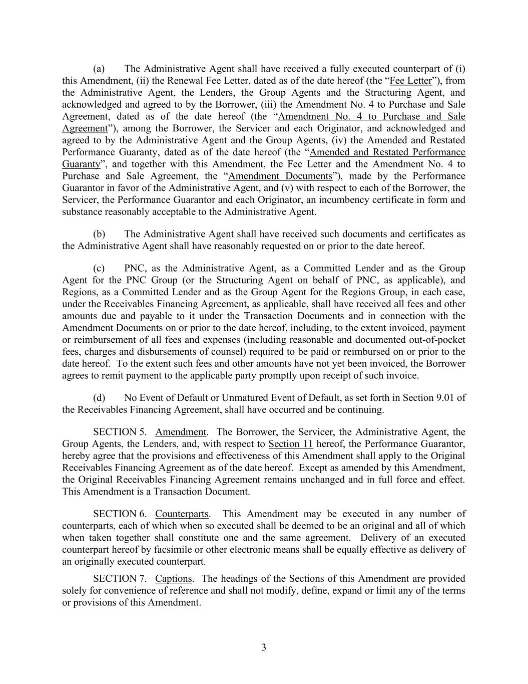 3 (a) The Administrative Agent shall have received a fully executed counterpart of (i) this Amendment, (ii) the Renewal Fee Letter, dated as of the date hereof (the “Fee Letter”), from the Administrative Agent, the Lenders, the Group Agents and the Structuring Agent, and acknowledged and agreed to by the Borrower, (iii) the Amendment No. 4 to Purchase and Sale Agreement, dated as of the date hereof (the “Amendment No. 4 to Purchase and Sale Agreement”), among the Borrower, the Servicer and each Originator, and acknowledged and agreed to by the Administrative Agent and the Group Agents, (iv) the Amended and Restated Performance Guaranty, dated as of the date hereof (the “Amended and Restated Performance Guaranty”, and together with this Amendment, the Fee Letter and the Amendment No. 4 to Purchase and Sale Agreement, the “Amendment Documents”), made by the Performance Guarantor in favor of the Administrative Agent, and (v) with respect to each of the Borrower, the Servicer, the Performance Guarantor and each Originator, an incumbency certificate in form and substance reasonably acceptable to the Administrative Agent. (b) The Administrative Agent shall have received such documents and certificates as the Administrative Agent shall have reasonably requested on or prior to the date hereof. (c) PNC, as the Administrative Agent, as a Committed Lender and as the Group Agent for the PNC Group (or the Structuring Agent on behalf of PNC, as applicable), and Regions, as a Committed Lender and as the Group Agent for the Regions Group, in each case, under the Receivables Financing Agreement, as applicable, shall have received all fees and other amounts due and payable to it under the Transaction Documents and in connection with the Amendment Documents on or prior to the date hereof, including, to the extent invoiced, payment or reimbursement of all fees and expenses (including reasonable and documented out-of-pocket fees, charges and disbursements of counsel) required to be paid or reimbursed on or prior to the date hereof. To the extent such fees and other amounts have not yet been invoiced, the Borrower agrees to remit payment to the applicable party promptly upon receipt of such invoice. (d) No Event of Default or Unmatured Event of Default, as set forth in Section 9.01 of the Receivables Financing Agreement, shall have occurred and be continuing. SECTION 5. Amendment. The Borrower, the Servicer, the Administrative Agent, the Group Agents, the Lenders, and, with respect to Section 11 hereof, the Performance Guarantor, hereby agree that the provisions and effectiveness of this Amendment shall apply to the Original Receivables Financing Agreement as of the date hereof. Except as amended by this Amendment, the Original Receivables Financing Agreement remains unchanged and in full force and effect. This Amendment is a Transaction Document. SECTION 6. Counterparts. This Amendment may be executed in any number of counterparts, each of which when so executed shall be deemed to be an original and all of which when taken together shall constitute one and the same agreement. Delivery of an executed counterpart hereof by facsimile or other electronic means shall be equally effective as delivery of an originally executed counterpart. SECTION 7. Captions. The headings of the Sections of this Amendment are provided solely for convenience of reference and shall not modify, define, expand or limit any of the terms or provisions of this Amendment.