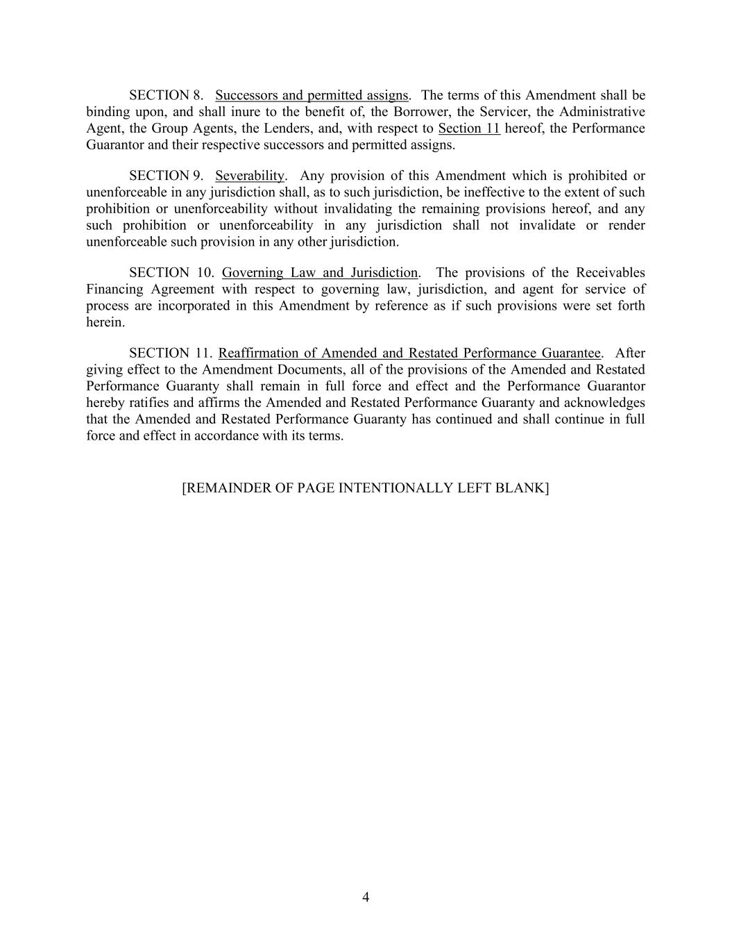 4 SECTION 8. Successors and permitted assigns. The terms of this Amendment shall be binding upon, and shall inure to the benefit of, the Borrower, the Servicer, the Administrative Agent, the Group Agents, the Lenders, and, with respect to Section 11 hereof, the Performance Guarantor and their respective successors and permitted assigns. SECTION 9. Severability. Any provision of this Amendment which is prohibited or unenforceable in any jurisdiction shall, as to such jurisdiction, be ineffective to the extent of such prohibition or unenforceability without invalidating the remaining provisions hereof, and any such prohibition or unenforceability in any jurisdiction shall not invalidate or render unenforceable such provision in any other jurisdiction. SECTION 10. Governing Law and Jurisdiction. The provisions of the Receivables Financing Agreement with respect to governing law, jurisdiction, and agent for service of process are incorporated in this Amendment by reference as if such provisions were set forth herein. SECTION 11. Reaffirmation of Amended and Restated Performance Guarantee. After giving effect to the Amendment Documents, all of the provisions of the Amended and Restated Performance Guaranty shall remain in full force and effect and the Performance Guarantor hereby ratifies and affirms the Amended and Restated Performance Guaranty and acknowledges that the Amended and Restated Performance Guaranty has continued and shall continue in full force and effect in accordance with its terms. [REMAINDER OF PAGE INTENTIONALLY LEFT BLANK]