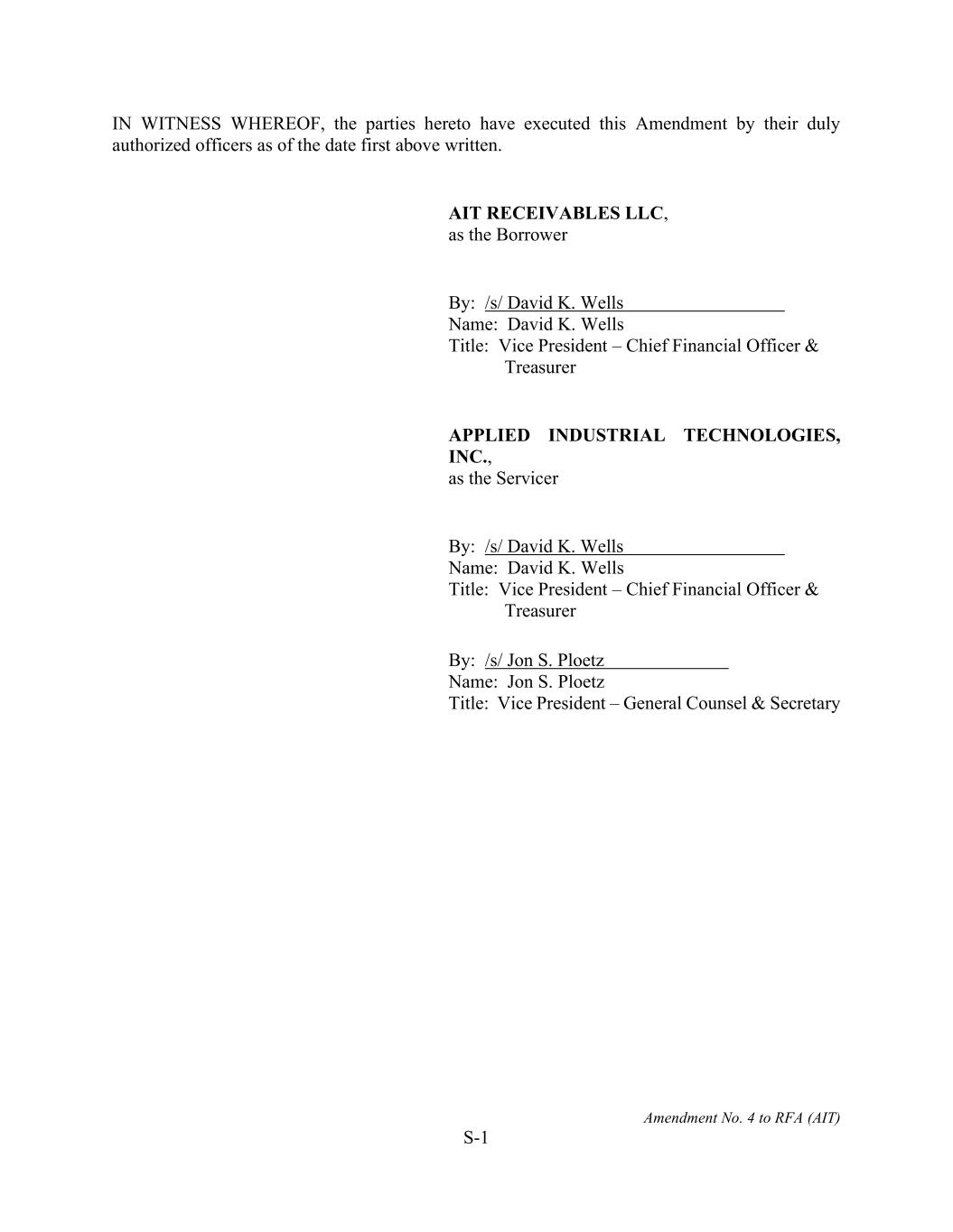 Amendment No. 4 to RFA (AIT) S-1 IN WITNESS WHEREOF, the parties hereto have executed this Amendment by their duly authorized officers as of the date first above written. AIT RECEIVABLES LLC, as the Borrower By: /s/ David K. Wells Name: David K. Wells Title: Vice President – Chief Financial Officer & Treasurer APPLIED INDUSTRIAL TECHNOLOGIES, INC., as the Servicer By: /s/ David K. Wells Name: David K. Wells Title: Vice President – Chief Financial Officer & Treasurer By: /s/ Jon S. Ploetz Name: Jon S. Ploetz Title: Vice President – General Counsel & Secretary