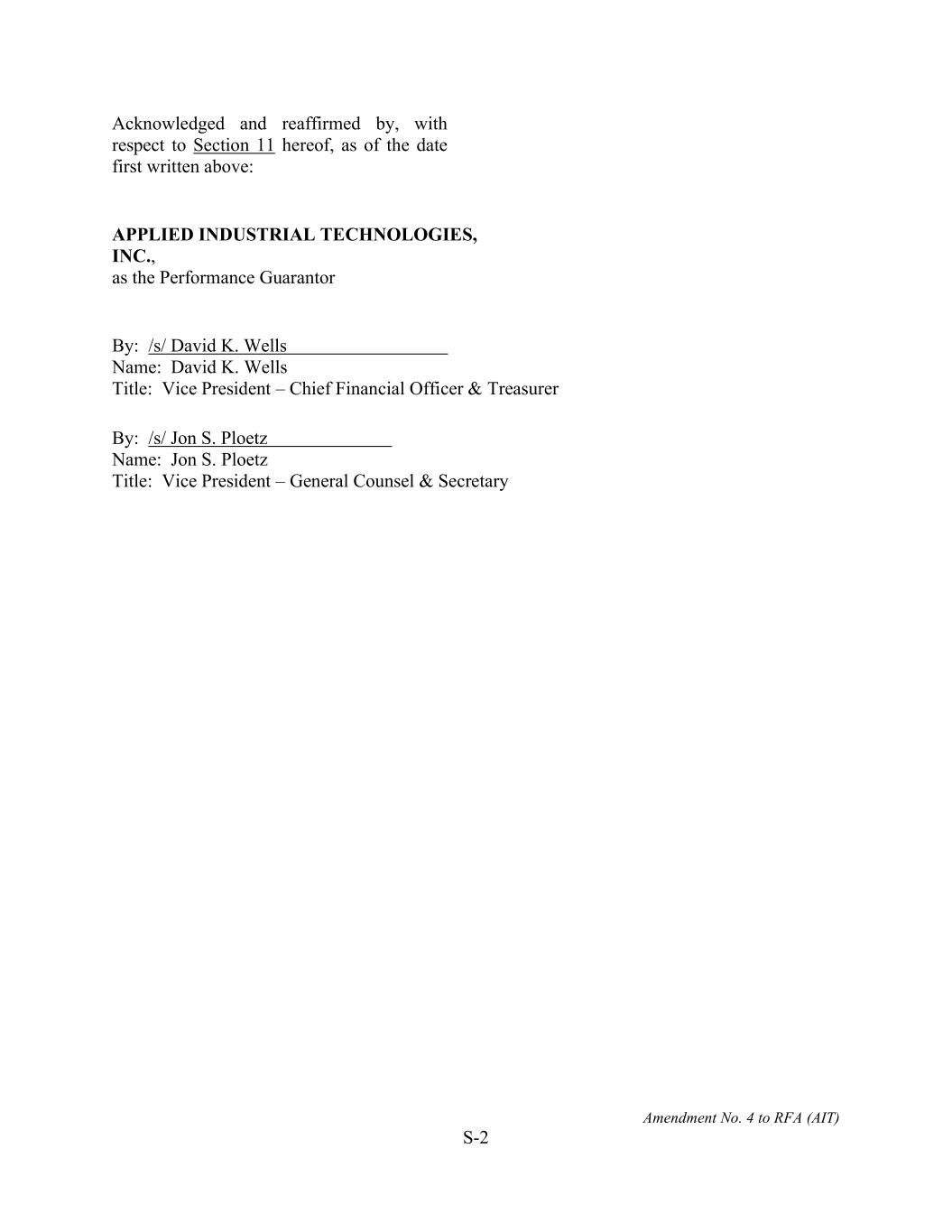 Amendment No. 4 to RFA (AIT) S-2 Acknowledged and reaffirmed by, with respect to Section 11 hereof, as of the date first written above: APPLIED INDUSTRIAL TECHNOLOGIES, INC., as the Performance Guarantor By: /s/ David K. Wells Name: David K. Wells Title: Vice President – Chief Financial Officer & Treasurer By: /s/ Jon S. Ploetz Name: Jon S. Ploetz Title: Vice President – General Counsel & Secretary