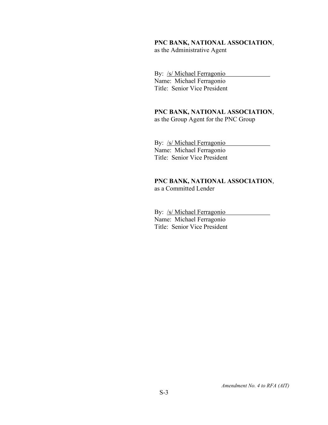 Amendment No. 4 to RFA (AIT) S-3 PNC BANK, NATIONAL ASSOCIATION, as the Administrative Agent By: /s/ Michael Ferragonio Name: Michael Ferragonio Title: Senior Vice President PNC BANK, NATIONAL ASSOCIATION, as the Group Agent for the PNC Group By: /s/ Michael Ferragonio Name: Michael Ferragonio Title: Senior Vice President PNC BANK, NATIONAL ASSOCIATION, as a Committed Lender By: /s/ Michael Ferragonio Name: Michael Ferragonio Title: Senior Vice President