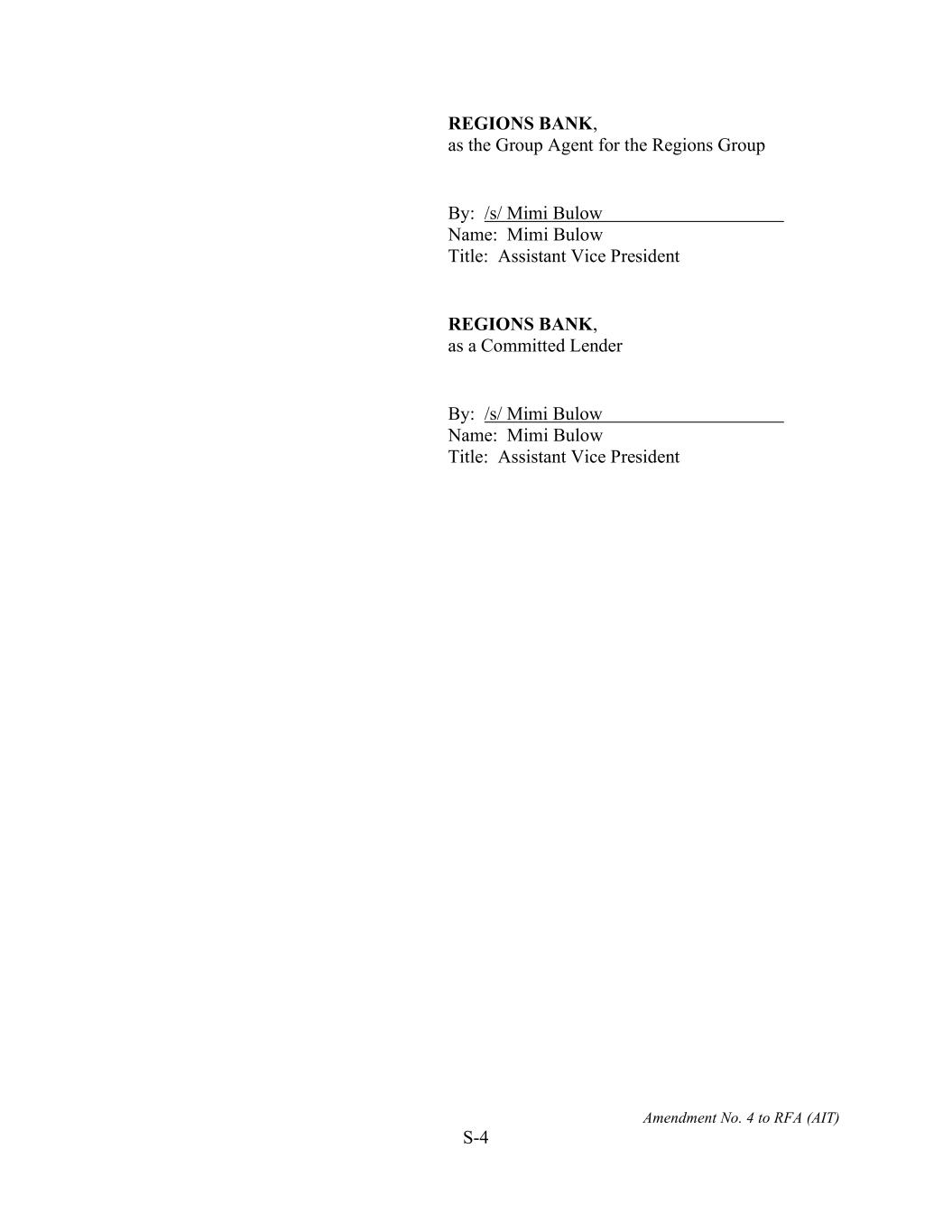Amendment No. 4 to RFA (AIT) S-4 REGIONS BANK, as the Group Agent for the Regions Group By: /s/ Mimi Bulow Name: Mimi Bulow Title: Assistant Vice President REGIONS BANK, as a Committed Lender By: /s/ Mimi Bulow Name: Mimi Bulow Title: Assistant Vice President