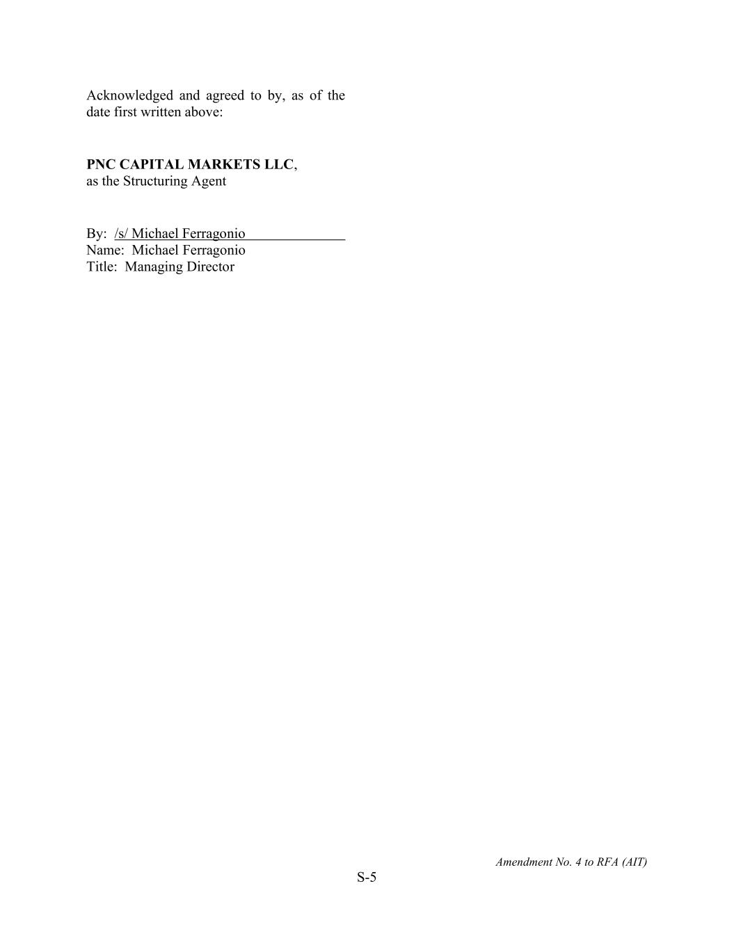 Amendment No. 4 to RFA (AIT) S-5 Acknowledged and agreed to by, as of the date first written above: PNC CAPITAL MARKETS LLC, as the Structuring Agent By: /s/ Michael Ferragonio Name: Michael Ferragonio Title: Managing Director