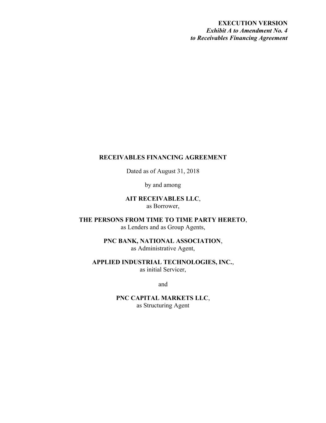EXECUTION VERSION Exhibit A to Amendment No. 4 to Receivables Financing Agreement RECEIVABLES FINANCING AGREEMENT Dated as of August 31, 2018 by and among AIT RECEIVABLES LLC, as Borrower, THE PERSONS FROM TIME TO TIME PARTY HERETO, as Lenders and as Group Agents, PNC BANK, NATIONAL ASSOCIATION, as Administrative Agent, APPLIED INDUSTRIAL TECHNOLOGIES, INC., as initial Servicer, and PNC CAPITAL MARKETS LLC, as Structuring Agent