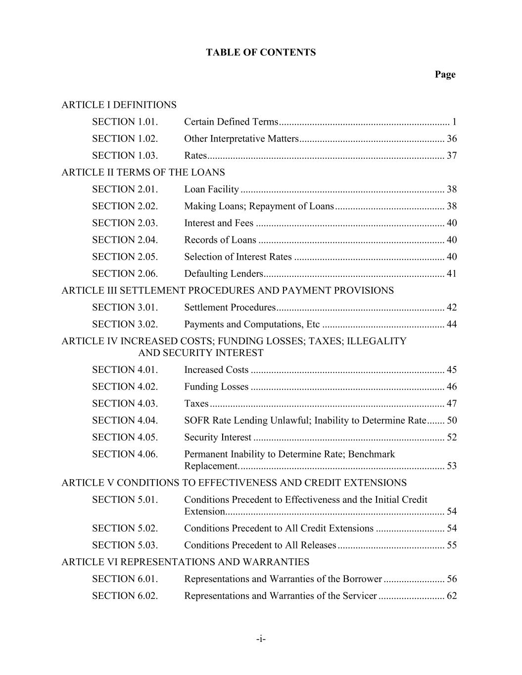 TABLE OF CONTENTS Page -i- ARTICLE I DEFINITIONS SECTION 1.01. Certain Defined Terms ................................................................... 1 SECTION 1.02. Other Interpretative Matters ......................................................... 36 SECTION 1.03. Rates ............................................................................................. 37 ARTICLE II TERMS OF THE LOANS SECTION 2.01. Loan Facility ................................................................................ 38 SECTION 2.02. Making Loans; Repayment of Loans ........................................... 38 SECTION 2.03. Interest and Fees .......................................................................... 40 SECTION 2.04. Records of Loans ......................................................................... 40 SECTION 2.05. Selection of Interest Rates ........................................................... 40 SECTION 2.06. Defaulting Lenders....................................................................... 41 ARTICLE III SETTLEMENT PROCEDURES AND PAYMENT PROVISIONS SECTION 3.01. Settlement Procedures .................................................................. 42 SECTION 3.02. Payments and Computations, Etc ................................................ 44 ARTICLE IV INCREASED COSTS; FUNDING LOSSES; TAXES; ILLEGALITY AND SECURITY INTEREST SECTION 4.01. Increased Costs ............................................................................ 45 SECTION 4.02. Funding Losses ............................................................................ 46 SECTION 4.03. Taxes ............................................................................................ 47 SECTION 4.04. SOFR Rate Lending Unlawful; Inability to Determine Rate ....... 50 SECTION 4.05. Security Interest ........................................................................... 52 SECTION 4.06. Permanent Inability to Determine Rate; Benchmark Replacement. ................................................................................ 53 ARTICLE V CONDITIONS TO EFFECTIVENESS AND CREDIT EXTENSIONS SECTION 5.01. Conditions Precedent to Effectiveness and the Initial Credit Extension...................................................................................... 54 SECTION 5.02. Conditions Precedent to All Credit Extensions ........................... 54 SECTION 5.03. Conditions Precedent to All Releases .......................................... 55 ARTICLE VI REPRESENTATIONS AND WARRANTIES SECTION 6.01. Representations and Warranties of the Borrower ........................ 56 SECTION 6.02. Representations and Warranties of the Servicer .......................... 62