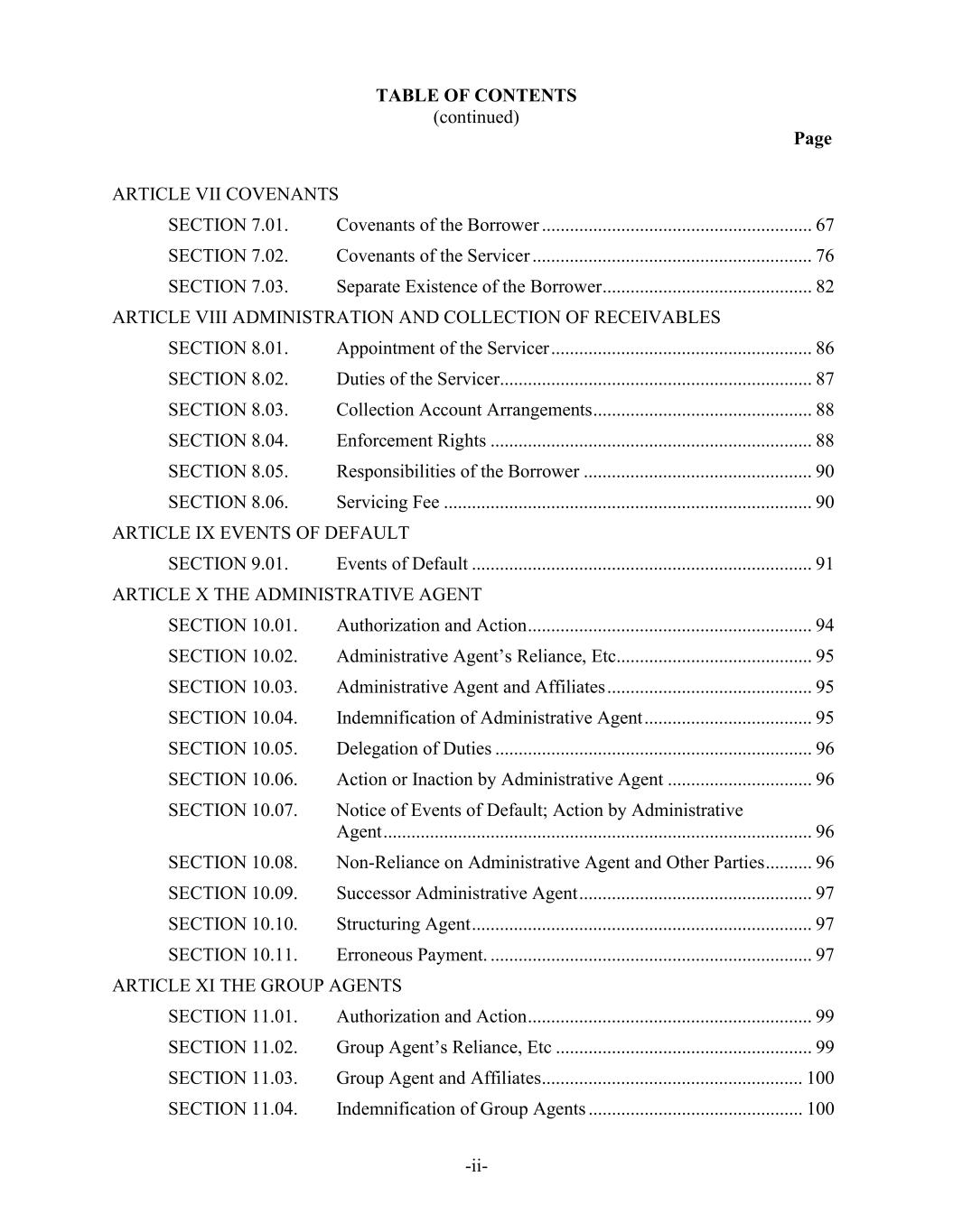 TABLE OF CONTENTS (continued) Page -ii- ARTICLE VII COVENANTS SECTION 7.01. Covenants of the Borrower .......................................................... 67 SECTION 7.02. Covenants of the Servicer ............................................................ 76 SECTION 7.03. Separate Existence of the Borrower ............................................. 82 ARTICLE VIII ADMINISTRATION AND COLLECTION OF RECEIVABLES SECTION 8.01. Appointment of the Servicer ........................................................ 86 SECTION 8.02. Duties of the Servicer................................................................... 87 SECTION 8.03. Collection Account Arrangements ............................................... 88 SECTION 8.04. Enforcement Rights ..................................................................... 88 SECTION 8.05. Responsibilities of the Borrower ................................................. 90 SECTION 8.06. Servicing Fee ............................................................................... 90 ARTICLE IX EVENTS OF DEFAULT SECTION 9.01. Events of Default ......................................................................... 91 ARTICLE X THE ADMINISTRATIVE AGENT SECTION 10.01. Authorization and Action ............................................................. 94 SECTION 10.02. Administrative Agent’s Reliance, Etc.......................................... 95 SECTION 10.03. Administrative Agent and Affiliates ............................................ 95 SECTION 10.04. Indemnification of Administrative Agent .................................... 95 SECTION 10.05. Delegation of Duties .................................................................... 96 SECTION 10.06. Action or Inaction by Administrative Agent ............................... 96 SECTION 10.07. Notice of Events of Default; Action by Administrative Agent ............................................................................................ 96 SECTION 10.08. Non-Reliance on Administrative Agent and Other Parties .......... 96 SECTION 10.09. Successor Administrative Agent .................................................. 97 SECTION 10.10. Structuring Agent ......................................................................... 97 SECTION 10.11. Erroneous Payment. ..................................................................... 97 ARTICLE XI THE GROUP AGENTS SECTION 11.01. Authorization and Action ............................................................. 99 SECTION 11.02. Group Agent’s Reliance, Etc ....................................................... 99 SECTION 11.03. Group Agent and Affiliates ........................................................ 100 SECTION 11.04. Indemnification of Group Agents .............................................. 100