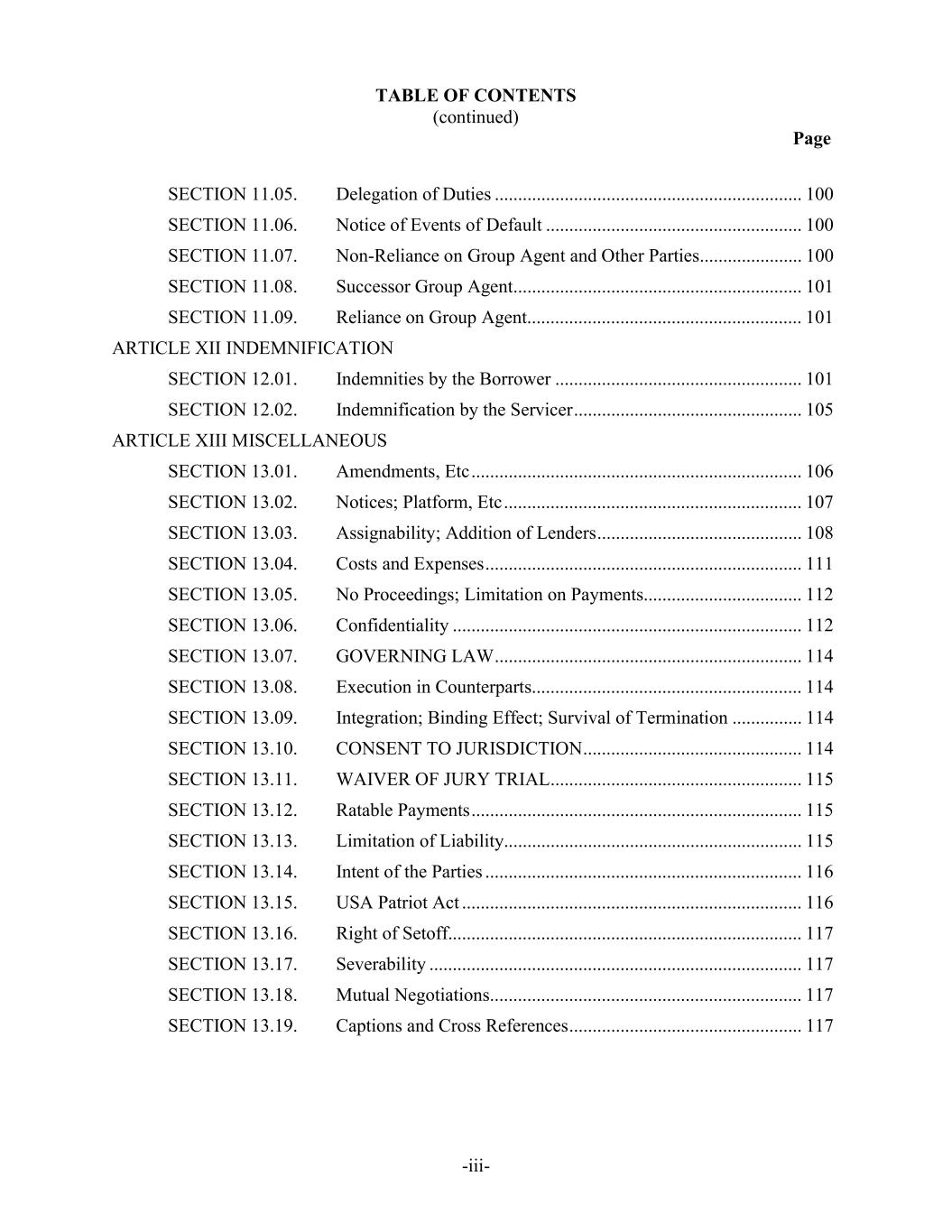 TABLE OF CONTENTS (continued) Page -iii- SECTION 11.05. Delegation of Duties .................................................................. 100 SECTION 11.06. Notice of Events of Default ....................................................... 100 SECTION 11.07. Non-Reliance on Group Agent and Other Parties...................... 100 SECTION 11.08. Successor Group Agent.............................................................. 101 SECTION 11.09. Reliance on Group Agent........................................................... 101 ARTICLE XII INDEMNIFICATION SECTION 12.01. Indemnities by the Borrower ..................................................... 101 SECTION 12.02. Indemnification by the Servicer ................................................. 105 ARTICLE XIII MISCELLANEOUS SECTION 13.01. Amendments, Etc ....................................................................... 106 SECTION 13.02. Notices; Platform, Etc ................................................................ 107 SECTION 13.03. Assignability; Addition of Lenders ............................................ 108 SECTION 13.04. Costs and Expenses .................................................................... 111 SECTION 13.05. No Proceedings; Limitation on Payments.................................. 112 SECTION 13.06. Confidentiality ........................................................................... 112 SECTION 13.07. GOVERNING LAW .................................................................. 114 SECTION 13.08. Execution in Counterparts.......................................................... 114 SECTION 13.09. Integration; Binding Effect; Survival of Termination ............... 114 SECTION 13.10. CONSENT TO JURISDICTION ............................................... 114 SECTION 13.11. WAIVER OF JURY TRIAL ...................................................... 115 SECTION 13.12. Ratable Payments ....................................................................... 115 SECTION 13.13. Limitation of Liability................................................................ 115 SECTION 13.14. Intent of the Parties .................................................................... 116 SECTION 13.15. USA Patriot Act ......................................................................... 116 SECTION 13.16. Right of Setoff............................................................................ 117 SECTION 13.17. Severability ................................................................................ 117 SECTION 13.18. Mutual Negotiations................................................................... 117 SECTION 13.19. Captions and Cross References .................................................. 117
