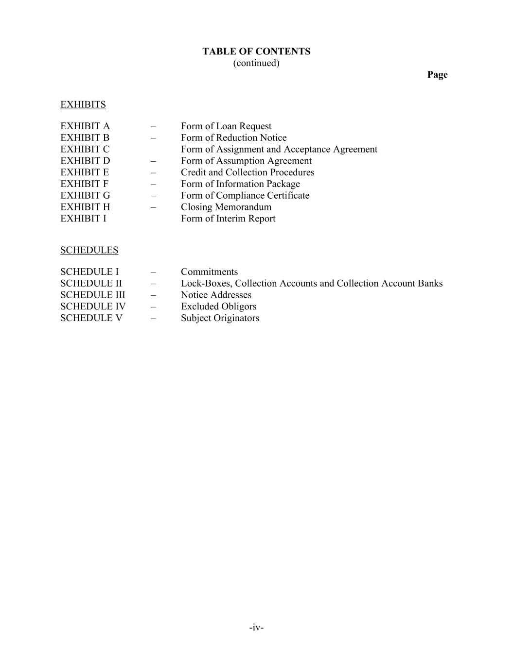 TABLE OF CONTENTS (continued) Page -iv- EXHIBITS EXHIBIT A – Form of Loan Request EXHIBIT B – Form of Reduction Notice EXHIBIT C Form of Assignment and Acceptance Agreement EXHIBIT D – Form of Assumption Agreement EXHIBIT E – Credit and Collection Procedures EXHIBIT F – Form of Information Package EXHIBIT G – Form of Compliance Certificate EXHIBIT H – Closing Memorandum EXHIBIT I Form of Interim Report SCHEDULES SCHEDULE I – Commitments SCHEDULE II – Lock-Boxes, Collection Accounts and Collection Account Banks SCHEDULE III – Notice Addresses SCHEDULE IV – Excluded Obligors SCHEDULE V – Subject Originators