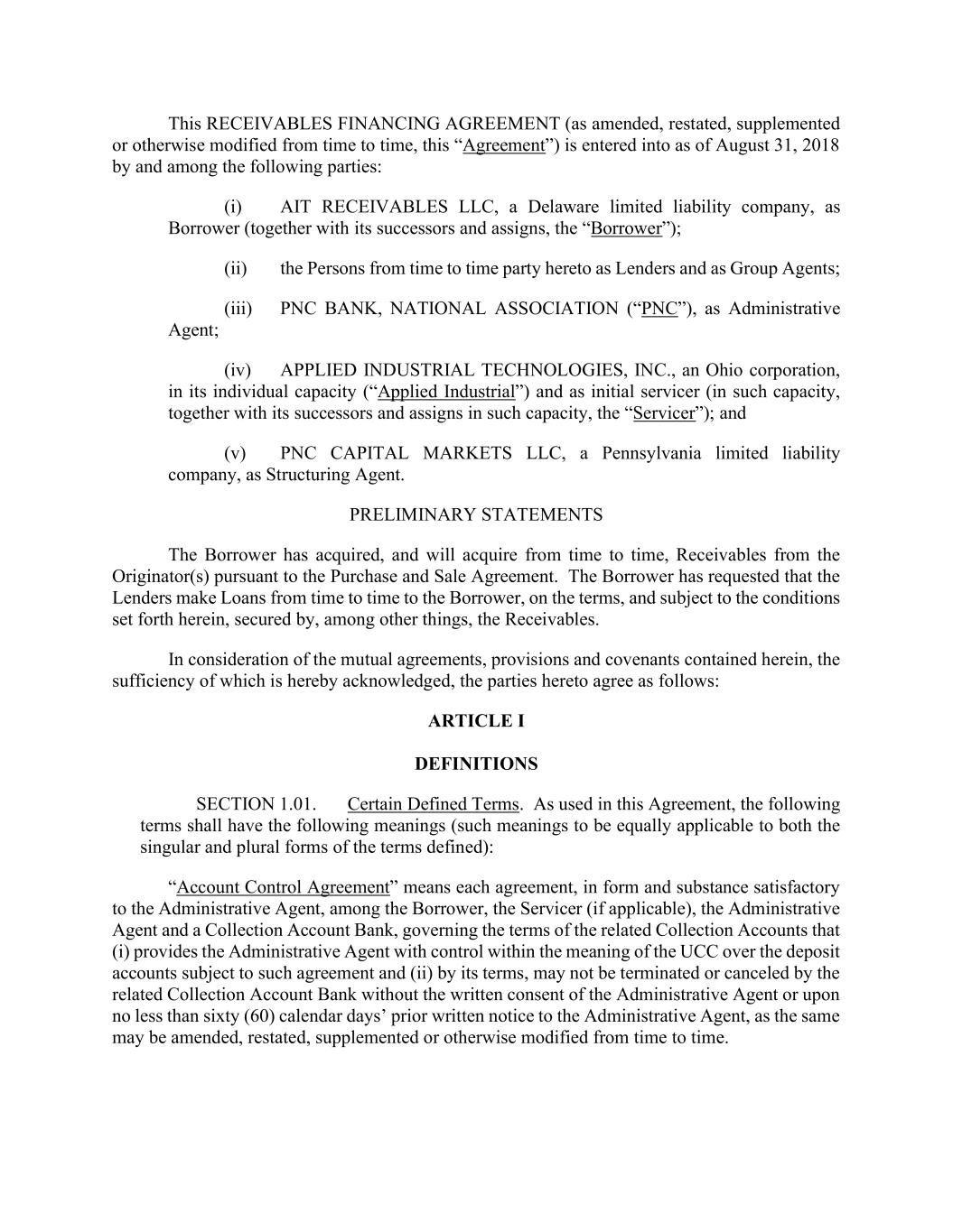 This RECEIVABLES FINANCING AGREEMENT (as amended, restated, supplemented or otherwise modified from time to time, this “Agreement”) is entered into as of August 31, 2018 by and among the following parties: (i) AIT RECEIVABLES LLC, a Delaware limited liability company, as Borrower (together with its successors and assigns, the “Borrower”); (ii) the Persons from time to time party hereto as Lenders and as Group Agents; (iii) PNC BANK, NATIONAL ASSOCIATION (“PNC”), as Administrative Agent; (iv) APPLIED INDUSTRIAL TECHNOLOGIES, INC., an Ohio corporation, in its individual capacity (“Applied Industrial”) and as initial servicer (in such capacity, together with its successors and assigns in such capacity, the “Servicer”); and (v) PNC CAPITAL MARKETS LLC, a Pennsylvania limited liability company, as Structuring Agent. PRELIMINARY STATEMENTS The Borrower has acquired, and will acquire from time to time, Receivables from the Originator(s) pursuant to the Purchase and Sale Agreement. The Borrower has requested that the Lenders make Loans from time to time to the Borrower, on the terms, and subject to the conditions set forth herein, secured by, among other things, the Receivables. In consideration of the mutual agreements, provisions and covenants contained herein, the sufficiency of which is hereby acknowledged, the parties hereto agree as follows: ARTICLE I DEFINITIONS SECTION 1.01. Certain Defined Terms. As used in this Agreement, the following terms shall have the following meanings (such meanings to be equally applicable to both the singular and plural forms of the terms defined): “Account Control Agreement” means each agreement, in form and substance satisfactory to the Administrative Agent, among the Borrower, the Servicer (if applicable), the Administrative Agent and a Collection Account Bank, governing the terms of the related Collection Accounts that (i) provides the Administrative Agent with control within the meaning of the UCC over the deposit accounts subject to such agreement and (ii) by its terms, may not be terminated or canceled by the related Collection Account Bank without the written consent of the Administrative Agent or upon no less than sixty (60) calendar days’ prior written notice to the Administrative Agent, as the same may be amended, restated, supplemented or otherwise modified from time to time.
