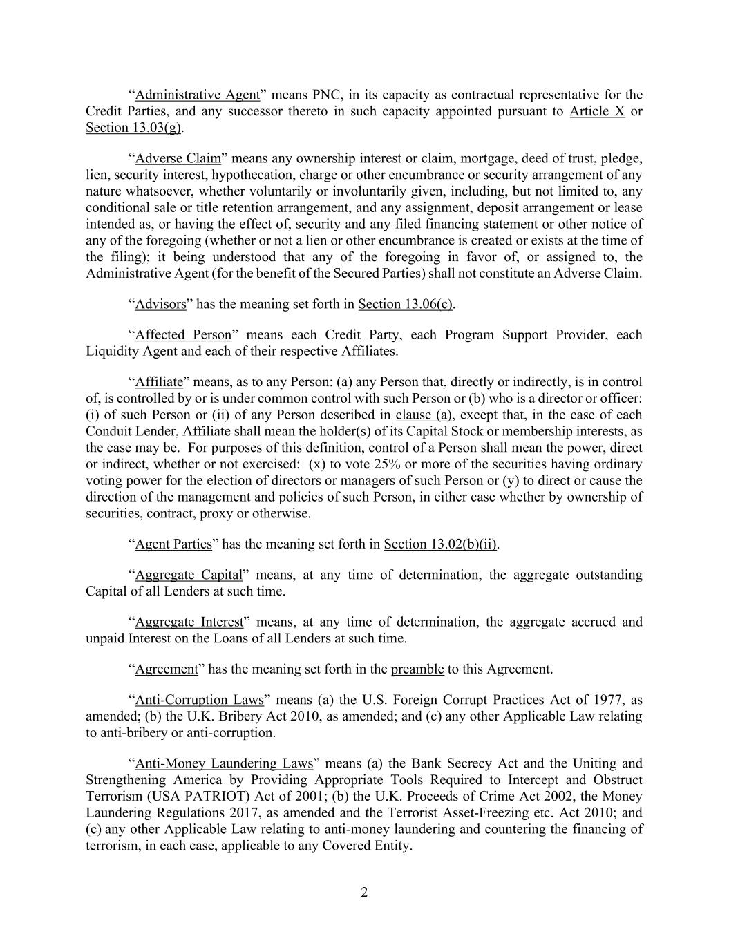 2 “Administrative Agent” means PNC, in its capacity as contractual representative for the Credit Parties, and any successor thereto in such capacity appointed pursuant to Article X or Section 13.03(g). “Adverse Claim” means any ownership interest or claim, mortgage, deed of trust, pledge, lien, security interest, hypothecation, charge or other encumbrance or security arrangement of any nature whatsoever, whether voluntarily or involuntarily given, including, but not limited to, any conditional sale or title retention arrangement, and any assignment, deposit arrangement or lease intended as, or having the effect of, security and any filed financing statement or other notice of any of the foregoing (whether or not a lien or other encumbrance is created or exists at the time of the filing); it being understood that any of the foregoing in favor of, or assigned to, the Administrative Agent (for the benefit of the Secured Parties) shall not constitute an Adverse Claim. “Advisors” has the meaning set forth in Section 13.06(c). “Affected Person” means each Credit Party, each Program Support Provider, each Liquidity Agent and each of their respective Affiliates. “Affiliate” means, as to any Person: (a) any Person that, directly or indirectly, is in control of, is controlled by or is under common control with such Person or (b) who is a director or officer: (i) of such Person or (ii) of any Person described in clause (a), except that, in the case of each Conduit Lender, Affiliate shall mean the holder(s) of its Capital Stock or membership interests, as the case may be. For purposes of this definition, control of a Person shall mean the power, direct or indirect, whether or not exercised: (x) to vote 25% or more of the securities having ordinary voting power for the election of directors or managers of such Person or (y) to direct or cause the direction of the management and policies of such Person, in either case whether by ownership of securities, contract, proxy or otherwise. “Agent Parties” has the meaning set forth in Section 13.02(b)(ii). “Aggregate Capital” means, at any time of determination, the aggregate outstanding Capital of all Lenders at such time. “Aggregate Interest” means, at any time of determination, the aggregate accrued and unpaid Interest on the Loans of all Lenders at such time. “Agreement” has the meaning set forth in the preamble to this Agreement. “Anti-Corruption Laws” means (a) the U.S. Foreign Corrupt Practices Act of 1977, as amended; (b) the U.K. Bribery Act 2010, as amended; and (c) any other Applicable Law relating to anti-bribery or anti-corruption. “Anti-Money Laundering Laws” means (a) the Bank Secrecy Act and the Uniting and Strengthening America by Providing Appropriate Tools Required to Intercept and Obstruct Terrorism (USA PATRIOT) Act of 2001; (b) the U.K. Proceeds of Crime Act 2002, the Money Laundering Regulations 2017, as amended and the Terrorist Asset-Freezing etc. Act 2010; and (c) any other Applicable Law relating to anti-money laundering and countering the financing of terrorism, in each case, applicable to any Covered Entity.