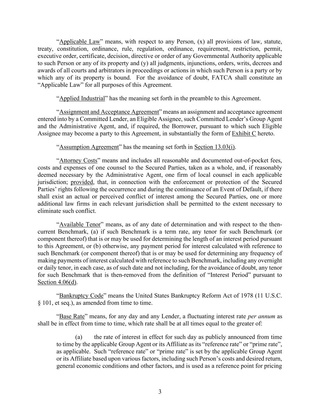 3 “Applicable Law” means, with respect to any Person, (x) all provisions of law, statute, treaty, constitution, ordinance, rule, regulation, ordinance, requirement, restriction, permit, executive order, certificate, decision, directive or order of any Governmental Authority applicable to such Person or any of its property and (y) all judgments, injunctions, orders, writs, decrees and awards of all courts and arbitrators in proceedings or actions in which such Person is a party or by which any of its property is bound. For the avoidance of doubt, FATCA shall constitute an “Applicable Law” for all purposes of this Agreement. “Applied Industrial” has the meaning set forth in the preamble to this Agreement. “Assignment and Acceptance Agreement” means an assignment and acceptance agreement entered into by a Committed Lender, an Eligible Assignee, such Committed Lender’s Group Agent and the Administrative Agent, and, if required, the Borrower, pursuant to which such Eligible Assignee may become a party to this Agreement, in substantially the form of Exhibit C hereto. “Assumption Agreement” has the meaning set forth in Section 13.03(i). “Attorney Costs” means and includes all reasonable and documented out-of-pocket fees, costs and expenses of one counsel to the Secured Parties, taken as a whole, and, if reasonably deemed necessary by the Administrative Agent, one firm of local counsel in each applicable jurisdiction; provided, that, in connection with the enforcement or protection of the Secured Parties’ rights following the occurrence and during the continuance of an Event of Default, if there shall exist an actual or perceived conflict of interest among the Secured Parties, one or more additional law firms in each relevant jurisdiction shall be permitted to the extent necessary to eliminate such conflict. “Available Tenor” means, as of any date of determination and with respect to the then- current Benchmark, (a) if such Benchmark is a term rate, any tenor for such Benchmark (or component thereof) that is or may be used for determining the length of an interest period pursuant to this Agreement, or (b) otherwise, any payment period for interest calculated with reference to such Benchmark (or component thereof) that is or may be used for determining any frequency of making payments of interest calculated with reference to such Benchmark, including any overnight or daily tenor, in each case, as of such date and not including, for the avoidance of doubt, any tenor for such Benchmark that is then-removed from the definition of “Interest Period” pursuant to Section 4.06(d). “Bankruptcy Code” means the United States Bankruptcy Reform Act of 1978 (11 U.S.C. § 101, et seq.), as amended from time to time. “Base Rate” means, for any day and any Lender, a fluctuating interest rate per annum as shall be in effect from time to time, which rate shall be at all times equal to the greater of: (a) the rate of interest in effect for such day as publicly announced from time to time by the applicable Group Agent or its Affiliate as its “reference rate” or “prime rate”, as applicable. Such “reference rate” or “prime rate” is set by the applicable Group Agent or its Affiliate based upon various factors, including such Person’s costs and desired return, general economic conditions and other factors, and is used as a reference point for pricing