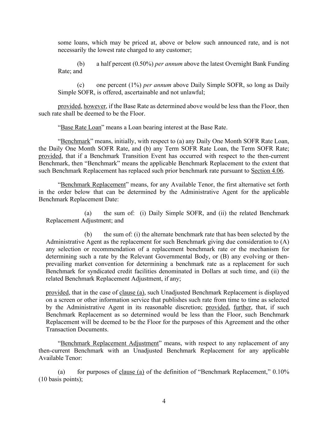 4 some loans, which may be priced at, above or below such announced rate, and is not necessarily the lowest rate charged to any customer; (b) a half percent (0.50%) per annum above the latest Overnight Bank Funding Rate; and (c) one percent (1%) per annum above Daily Simple SOFR, so long as Daily Simple SOFR, is offered, ascertainable and not unlawful; provided, however, if the Base Rate as determined above would be less than the Floor, then such rate shall be deemed to be the Floor. “Base Rate Loan” means a Loan bearing interest at the Base Rate. “Benchmark” means, initially, with respect to (a) any Daily One Month SOFR Rate Loan, the Daily One Month SOFR Rate, and (b) any Term SOFR Rate Loan, the Term SOFR Rate; provided, that if a Benchmark Transition Event has occurred with respect to the then-current Benchmark, then “Benchmark” means the applicable Benchmark Replacement to the extent that such Benchmark Replacement has replaced such prior benchmark rate pursuant to Section 4.06. “Benchmark Replacement” means, for any Available Tenor, the first alternative set forth in the order below that can be determined by the Administrative Agent for the applicable Benchmark Replacement Date: (a) the sum of: (i) Daily Simple SOFR, and (ii) the related Benchmark Replacement Adjustment; and (b) the sum of: (i) the alternate benchmark rate that has been selected by the Administrative Agent as the replacement for such Benchmark giving due consideration to (A) any selection or recommendation of a replacement benchmark rate or the mechanism for determining such a rate by the Relevant Governmental Body, or (B) any evolving or then- prevailing market convention for determining a benchmark rate as a replacement for such Benchmark for syndicated credit facilities denominated in Dollars at such time, and (ii) the related Benchmark Replacement Adjustment, if any; provided, that in the case of clause (a), such Unadjusted Benchmark Replacement is displayed on a screen or other information service that publishes such rate from time to time as selected by the Administrative Agent in its reasonable discretion; provided, further, that, if such Benchmark Replacement as so determined would be less than the Floor, such Benchmark Replacement will be deemed to be the Floor for the purposes of this Agreement and the other Transaction Documents. “Benchmark Replacement Adjustment” means, with respect to any replacement of any then-current Benchmark with an Unadjusted Benchmark Replacement for any applicable Available Tenor: (a) for purposes of clause (a) of the definition of “Benchmark Replacement,” 0.10% (10 basis points);