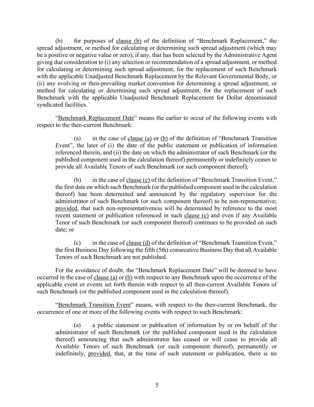5 (b) for purposes of clause (b) of the definition of “Benchmark Replacement,” the spread adjustment, or method for calculating or determining such spread adjustment (which may be a positive or negative value or zero), if any, that has been selected by the Administrative Agent giving due consideration to (i) any selection or recommendation of a spread adjustment, or method for calculating or determining such spread adjustment, for the replacement of such Benchmark with the applicable Unadjusted Benchmark Replacement by the Relevant Governmental Body, or (ii) any evolving or then-prevailing market convention for determining a spread adjustment, or method for calculating or determining such spread adjustment, for the replacement of such Benchmark with the applicable Unadjusted Benchmark Replacement for Dollar denominated syndicated facilities. “Benchmark Replacement Date” means the earlier to occur of the following events with respect to the then-current Benchmark: (a) in the case of clause (a) or (b) of the definition of “Benchmark Transition Event”, the later of (i) the date of the public statement or publication of information referenced therein, and (ii) the date on which the administrator of such Benchmark (or the published component used in the calculation thereof) permanently or indefinitely ceases to provide all Available Tenors of such Benchmark (or such component thereof); (b) in the case of clause (c) of the definition of “Benchmark Transition Event,” the first date on which such Benchmark (or the published component used in the calculation thereof) has been determined and announced by the regulatory supervisor for the administrator of such Benchmark (or such component thereof) to be non-representative; provided, that such non-representativeness will be determined by reference to the most recent statement or publication referenced in such clause (c) and even if any Available Tenor of such Benchmark (or such component thereof) continues to be provided on such date; or (c) in the case of clause (d) of the definition of “Benchmark Transition Event,” the first Business Day following the fifth (5th) consecutive Business Day that all Available Tenors of such Benchmark are not published. For the avoidance of doubt, the “Benchmark Replacement Date” will be deemed to have occurred in the case of clause (a) or (b) with respect to any Benchmark upon the occurrence of the applicable event or events set forth therein with respect to all then-current Available Tenors of such Benchmark (or the published component used in the calculation thereof). “Benchmark Transition Event” means, with respect to the then-current Benchmark, the occurrence of one or more of the following events with respect to such Benchmark: (a) a public statement or publication of information by or on behalf of the administrator of such Benchmark (or the published component used in the calculation thereof) announcing that such administrator has ceased or will cease to provide all Available Tenors of such Benchmark (or such component thereof), permanently or indefinitely, provided, that, at the time of such statement or publication, there is no