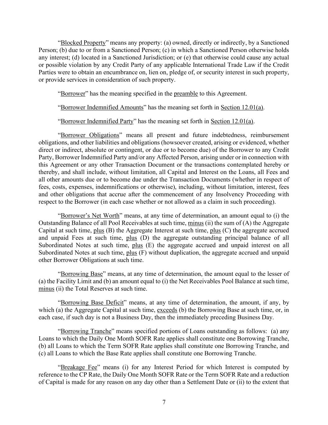 7 “Blocked Property” means any property: (a) owned, directly or indirectly, by a Sanctioned Person; (b) due to or from a Sanctioned Person; (c) in which a Sanctioned Person otherwise holds any interest; (d) located in a Sanctioned Jurisdiction; or (e) that otherwise could cause any actual or possible violation by any Credit Party of any applicable International Trade Law if the Credit Parties were to obtain an encumbrance on, lien on, pledge of, or security interest in such property, or provide services in consideration of such property. “Borrower” has the meaning specified in the preamble to this Agreement. “Borrower Indemnified Amounts” has the meaning set forth in Section 12.01(a). “Borrower Indemnified Party” has the meaning set forth in Section 12.01(a). “Borrower Obligations” means all present and future indebtedness, reimbursement obligations, and other liabilities and obligations (howsoever created, arising or evidenced, whether direct or indirect, absolute or contingent, or due or to become due) of the Borrower to any Credit Party, Borrower Indemnified Party and/or any Affected Person, arising under or in connection with this Agreement or any other Transaction Document or the transactions contemplated hereby or thereby, and shall include, without limitation, all Capital and Interest on the Loans, all Fees and all other amounts due or to become due under the Transaction Documents (whether in respect of fees, costs, expenses, indemnifications or otherwise), including, without limitation, interest, fees and other obligations that accrue after the commencement of any Insolvency Proceeding with respect to the Borrower (in each case whether or not allowed as a claim in such proceeding). “Borrower’s Net Worth” means, at any time of determination, an amount equal to (i) the Outstanding Balance of all Pool Receivables at such time, minus (ii) the sum of (A) the Aggregate Capital at such time, plus (B) the Aggregate Interest at such time, plus (C) the aggregate accrued and unpaid Fees at such time, plus (D) the aggregate outstanding principal balance of all Subordinated Notes at such time, plus (E) the aggregate accrued and unpaid interest on all Subordinated Notes at such time, plus (F) without duplication, the aggregate accrued and unpaid other Borrower Obligations at such time. “Borrowing Base” means, at any time of determination, the amount equal to the lesser of (a) the Facility Limit and (b) an amount equal to (i) the Net Receivables Pool Balance at such time, minus (ii) the Total Reserves at such time. “Borrowing Base Deficit” means, at any time of determination, the amount, if any, by which (a) the Aggregate Capital at such time, exceeds (b) the Borrowing Base at such time, or, in each case, if such day is not a Business Day, then the immediately preceding Business Day. “Borrowing Tranche” means specified portions of Loans outstanding as follows: (a) any Loans to which the Daily One Month SOFR Rate applies shall constitute one Borrowing Tranche, (b) all Loans to which the Term SOFR Rate applies shall constitute one Borrowing Tranche, and (c) all Loans to which the Base Rate applies shall constitute one Borrowing Tranche. “Breakage Fee” means (i) for any Interest Period for which Interest is computed by reference to the CP Rate, the Daily One Month SOFR Rate or the Term SOFR Rate and a reduction of Capital is made for any reason on any day other than a Settlement Date or (ii) to the extent that