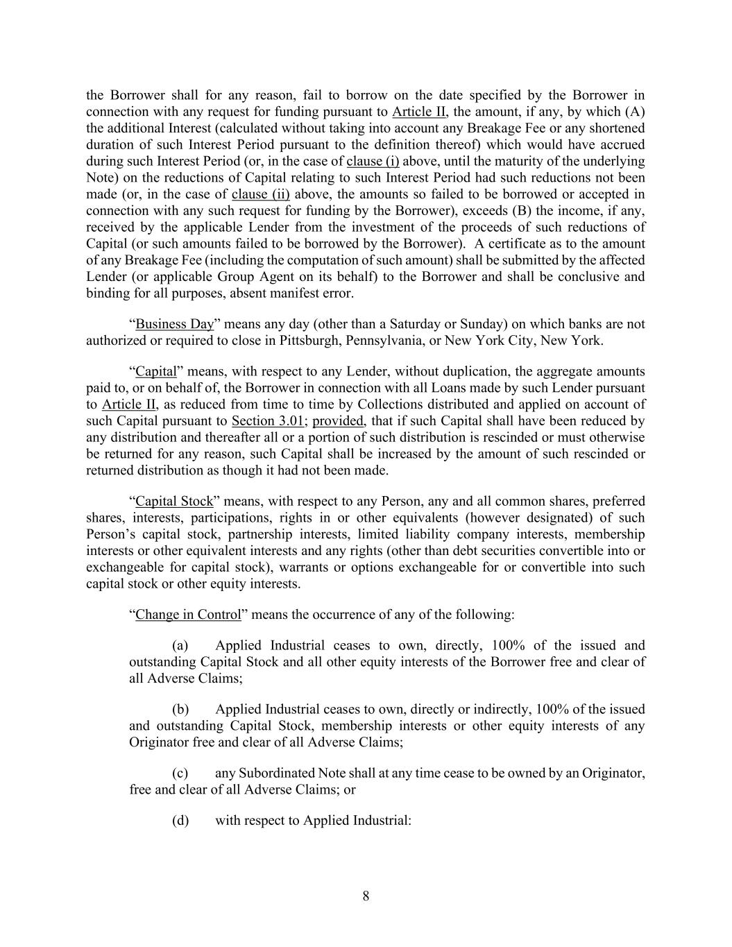 8 the Borrower shall for any reason, fail to borrow on the date specified by the Borrower in connection with any request for funding pursuant to Article II, the amount, if any, by which (A) the additional Interest (calculated without taking into account any Breakage Fee or any shortened duration of such Interest Period pursuant to the definition thereof) which would have accrued during such Interest Period (or, in the case of clause (i) above, until the maturity of the underlying Note) on the reductions of Capital relating to such Interest Period had such reductions not been made (or, in the case of clause (ii) above, the amounts so failed to be borrowed or accepted in connection with any such request for funding by the Borrower), exceeds (B) the income, if any, received by the applicable Lender from the investment of the proceeds of such reductions of Capital (or such amounts failed to be borrowed by the Borrower). A certificate as to the amount of any Breakage Fee (including the computation of such amount) shall be submitted by the affected Lender (or applicable Group Agent on its behalf) to the Borrower and shall be conclusive and binding for all purposes, absent manifest error. “Business Day” means any day (other than a Saturday or Sunday) on which banks are not authorized or required to close in Pittsburgh, Pennsylvania, or New York City, New York. “Capital” means, with respect to any Lender, without duplication, the aggregate amounts paid to, or on behalf of, the Borrower in connection with all Loans made by such Lender pursuant to Article II, as reduced from time to time by Collections distributed and applied on account of such Capital pursuant to Section 3.01; provided, that if such Capital shall have been reduced by any distribution and thereafter all or a portion of such distribution is rescinded or must otherwise be returned for any reason, such Capital shall be increased by the amount of such rescinded or returned distribution as though it had not been made. “Capital Stock” means, with respect to any Person, any and all common shares, preferred shares, interests, participations, rights in or other equivalents (however designated) of such Person’s capital stock, partnership interests, limited liability company interests, membership interests or other equivalent interests and any rights (other than debt securities convertible into or exchangeable for capital stock), warrants or options exchangeable for or convertible into such capital stock or other equity interests. “Change in Control” means the occurrence of any of the following: (a) Applied Industrial ceases to own, directly, 100% of the issued and outstanding Capital Stock and all other equity interests of the Borrower free and clear of all Adverse Claims; (b) Applied Industrial ceases to own, directly or indirectly, 100% of the issued and outstanding Capital Stock, membership interests or other equity interests of any Originator free and clear of all Adverse Claims; (c) any Subordinated Note shall at any time cease to be owned by an Originator, free and clear of all Adverse Claims; or (d) with respect to Applied Industrial: