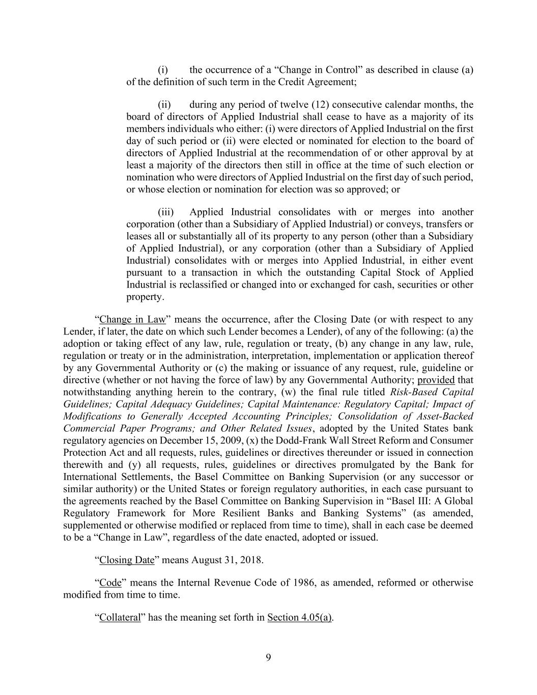 9 (i) the occurrence of a “Change in Control” as described in clause (a) of the definition of such term in the Credit Agreement; (ii) during any period of twelve (12) consecutive calendar months, the board of directors of Applied Industrial shall cease to have as a majority of its members individuals who either: (i) were directors of Applied Industrial on the first day of such period or (ii) were elected or nominated for election to the board of directors of Applied Industrial at the recommendation of or other approval by at least a majority of the directors then still in office at the time of such election or nomination who were directors of Applied Industrial on the first day of such period, or whose election or nomination for election was so approved; or (iii) Applied Industrial consolidates with or merges into another corporation (other than a Subsidiary of Applied Industrial) or conveys, transfers or leases all or substantially all of its property to any person (other than a Subsidiary of Applied Industrial), or any corporation (other than a Subsidiary of Applied Industrial) consolidates with or merges into Applied Industrial, in either event pursuant to a transaction in which the outstanding Capital Stock of Applied Industrial is reclassified or changed into or exchanged for cash, securities or other property. “Change in Law” means the occurrence, after the Closing Date (or with respect to any Lender, if later, the date on which such Lender becomes a Lender), of any of the following: (a) the adoption or taking effect of any law, rule, regulation or treaty, (b) any change in any law, rule, regulation or treaty or in the administration, interpretation, implementation or application thereof by any Governmental Authority or (c) the making or issuance of any request, rule, guideline or directive (whether or not having the force of law) by any Governmental Authority; provided that notwithstanding anything herein to the contrary, (w) the final rule titled Risk-Based Capital Guidelines; Capital Adequacy Guidelines; Capital Maintenance: Regulatory Capital; Impact of Modifications to Generally Accepted Accounting Principles; Consolidation of Asset-Backed Commercial Paper Programs; and Other Related Issues, adopted by the United States bank regulatory agencies on December 15, 2009, (x) the Dodd-Frank Wall Street Reform and Consumer Protection Act and all requests, rules, guidelines or directives thereunder or issued in connection therewith and (y) all requests, rules, guidelines or directives promulgated by the Bank for International Settlements, the Basel Committee on Banking Supervision (or any successor or similar authority) or the United States or foreign regulatory authorities, in each case pursuant to the agreements reached by the Basel Committee on Banking Supervision in “Basel III: A Global Regulatory Framework for More Resilient Banks and Banking Systems” (as amended, supplemented or otherwise modified or replaced from time to time), shall in each case be deemed to be a “Change in Law”, regardless of the date enacted, adopted or issued. “Closing Date” means August 31, 2018. “Code” means the Internal Revenue Code of 1986, as amended, reformed or otherwise modified from time to time. “Collateral” has the meaning set forth in Section 4.05(a).