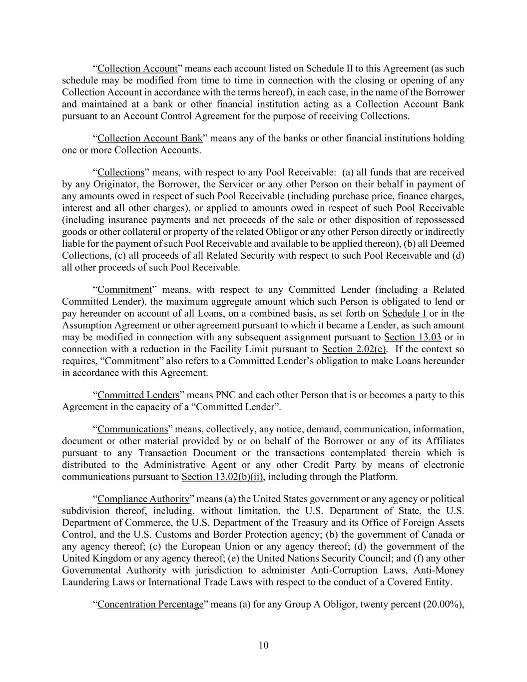 10 “Collection Account” means each account listed on Schedule II to this Agreement (as such schedule may be modified from time to time in connection with the closing or opening of any Collection Account in accordance with the terms hereof), in each case, in the name of the Borrower and maintained at a bank or other financial institution acting as a Collection Account Bank pursuant to an Account Control Agreement for the purpose of receiving Collections. “Collection Account Bank” means any of the banks or other financial institutions holding one or more Collection Accounts. “Collections” means, with respect to any Pool Receivable: (a) all funds that are received by any Originator, the Borrower, the Servicer or any other Person on their behalf in payment of any amounts owed in respect of such Pool Receivable (including purchase price, finance charges, interest and all other charges), or applied to amounts owed in respect of such Pool Receivable (including insurance payments and net proceeds of the sale or other disposition of repossessed goods or other collateral or property of the related Obligor or any other Person directly or indirectly liable for the payment of such Pool Receivable and available to be applied thereon), (b) all Deemed Collections, (c) all proceeds of all Related Security with respect to such Pool Receivable and (d) all other proceeds of such Pool Receivable. “Commitment” means, with respect to any Committed Lender (including a Related Committed Lender), the maximum aggregate amount which such Person is obligated to lend or pay hereunder on account of all Loans, on a combined basis, as set forth on Schedule I or in the Assumption Agreement or other agreement pursuant to which it became a Lender, as such amount may be modified in connection with any subsequent assignment pursuant to Section 13.03 or in connection with a reduction in the Facility Limit pursuant to Section 2.02(e). If the context so requires, “Commitment” also refers to a Committed Lender’s obligation to make Loans hereunder in accordance with this Agreement. “Committed Lenders” means PNC and each other Person that is or becomes a party to this Agreement in the capacity of a “Committed Lender”. “Communications” means, collectively, any notice, demand, communication, information, document or other material provided by or on behalf of the Borrower or any of its Affiliates pursuant to any Transaction Document or the transactions contemplated therein which is distributed to the Administrative Agent or any other Credit Party by means of electronic communications pursuant to Section 13.02(b)(ii), including through the Platform. “Compliance Authority” means (a) the United States government or any agency or political subdivision thereof, including, without limitation, the U.S. Department of State, the U.S. Department of Commerce, the U.S. Department of the Treasury and its Office of Foreign Assets Control, and the U.S. Customs and Border Protection agency; (b) the government of Canada or any agency thereof; (c) the European Union or any agency thereof; (d) the government of the United Kingdom or any agency thereof; (e) the United Nations Security Council; and (f) any other Governmental Authority with jurisdiction to administer Anti-Corruption Laws, Anti-Money Laundering Laws or International Trade Laws with respect to the conduct of a Covered Entity. “Concentration Percentage” means (a) for any Group A Obligor, twenty percent (20.00%),