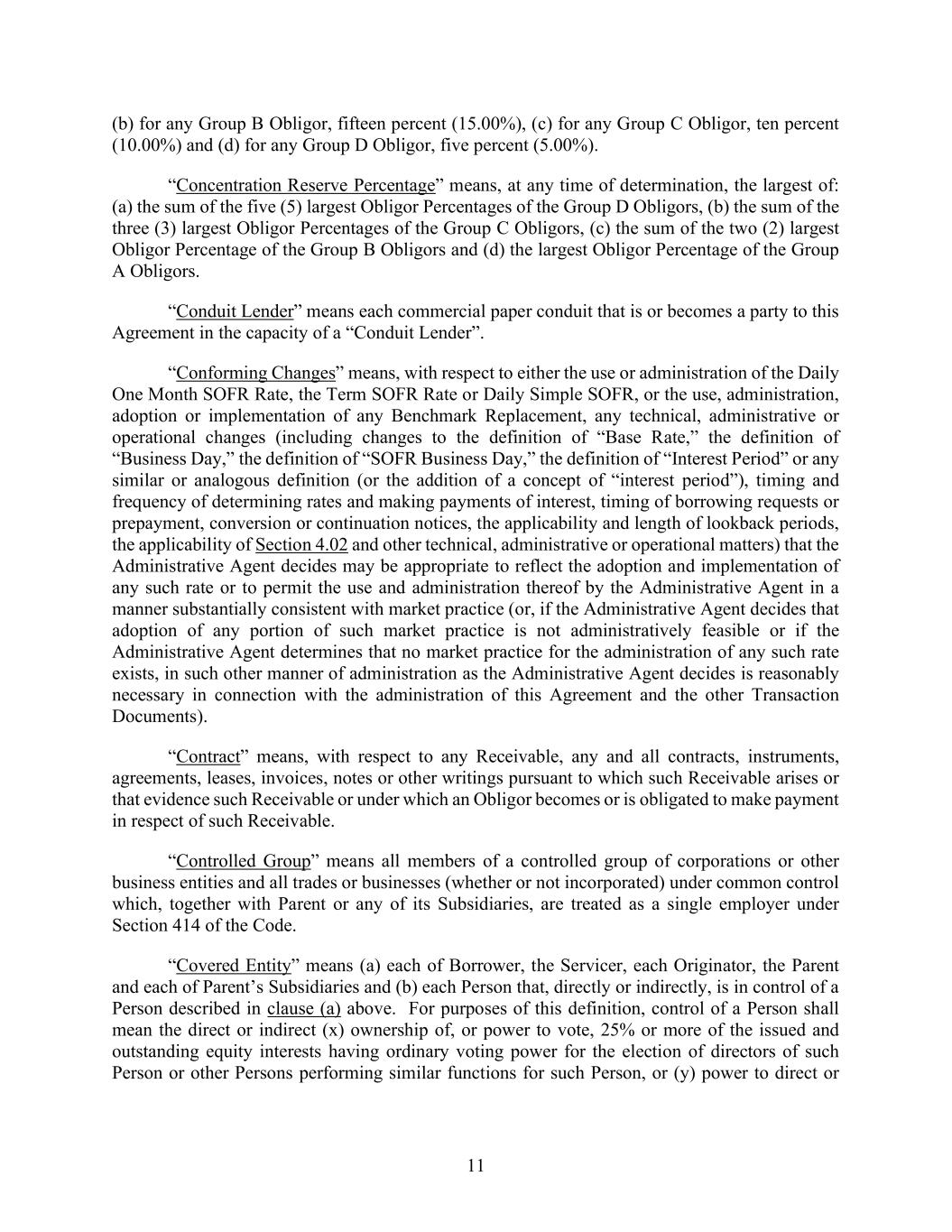 11 (b) for any Group B Obligor, fifteen percent (15.00%), (c) for any Group C Obligor, ten percent (10.00%) and (d) for any Group D Obligor, five percent (5.00%). “Concentration Reserve Percentage” means, at any time of determination, the largest of: (a) the sum of the five (5) largest Obligor Percentages of the Group D Obligors, (b) the sum of the three (3) largest Obligor Percentages of the Group C Obligors, (c) the sum of the two (2) largest Obligor Percentage of the Group B Obligors and (d) the largest Obligor Percentage of the Group A Obligors. “Conduit Lender” means each commercial paper conduit that is or becomes a party to this Agreement in the capacity of a “Conduit Lender”. “Conforming Changes” means, with respect to either the use or administration of the Daily One Month SOFR Rate, the Term SOFR Rate or Daily Simple SOFR, or the use, administration, adoption or implementation of any Benchmark Replacement, any technical, administrative or operational changes (including changes to the definition of “Base Rate,” the definition of “Business Day,” the definition of “SOFR Business Day,” the definition of “Interest Period” or any similar or analogous definition (or the addition of a concept of “interest period”), timing and frequency of determining rates and making payments of interest, timing of borrowing requests or prepayment, conversion or continuation notices, the applicability and length of lookback periods, the applicability of Section 4.02 and other technical, administrative or operational matters) that the Administrative Agent decides may be appropriate to reflect the adoption and implementation of any such rate or to permit the use and administration thereof by the Administrative Agent in a manner substantially consistent with market practice (or, if the Administrative Agent decides that adoption of any portion of such market practice is not administratively feasible or if the Administrative Agent determines that no market practice for the administration of any such rate exists, in such other manner of administration as the Administrative Agent decides is reasonably necessary in connection with the administration of this Agreement and the other Transaction Documents). “Contract” means, with respect to any Receivable, any and all contracts, instruments, agreements, leases, invoices, notes or other writings pursuant to which such Receivable arises or that evidence such Receivable or under which an Obligor becomes or is obligated to make payment in respect of such Receivable. “Controlled Group” means all members of a controlled group of corporations or other business entities and all trades or businesses (whether or not incorporated) under common control which, together with Parent or any of its Subsidiaries, are treated as a single employer under Section 414 of the Code. “Covered Entity” means (a) each of Borrower, the Servicer, each Originator, the Parent and each of Parent’s Subsidiaries and (b) each Person that, directly or indirectly, is in control of a Person described in clause (a) above. For purposes of this definition, control of a Person shall mean the direct or indirect (x) ownership of, or power to vote, 25% or more of the issued and outstanding equity interests having ordinary voting power for the election of directors of such Person or other Persons performing similar functions for such Person, or (y) power to direct or
