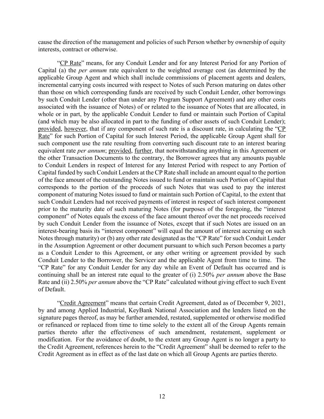 12 cause the direction of the management and policies of such Person whether by ownership of equity interests, contract or otherwise. “CP Rate” means, for any Conduit Lender and for any Interest Period for any Portion of Capital (a) the per annum rate equivalent to the weighted average cost (as determined by the applicable Group Agent and which shall include commissions of placement agents and dealers, incremental carrying costs incurred with respect to Notes of such Person maturing on dates other than those on which corresponding funds are received by such Conduit Lender, other borrowings by such Conduit Lender (other than under any Program Support Agreement) and any other costs associated with the issuance of Notes) of or related to the issuance of Notes that are allocated, in whole or in part, by the applicable Conduit Lender to fund or maintain such Portion of Capital (and which may be also allocated in part to the funding of other assets of such Conduit Lender); provided, however, that if any component of such rate is a discount rate, in calculating the “CP Rate” for such Portion of Capital for such Interest Period, the applicable Group Agent shall for such component use the rate resulting from converting such discount rate to an interest bearing equivalent rate per annum; provided, further, that notwithstanding anything in this Agreement or the other Transaction Documents to the contrary, the Borrower agrees that any amounts payable to Conduit Lenders in respect of Interest for any Interest Period with respect to any Portion of Capital funded by such Conduit Lenders at the CP Rate shall include an amount equal to the portion of the face amount of the outstanding Notes issued to fund or maintain such Portion of Capital that corresponds to the portion of the proceeds of such Notes that was used to pay the interest component of maturing Notes issued to fund or maintain such Portion of Capital, to the extent that such Conduit Lenders had not received payments of interest in respect of such interest component prior to the maturity date of such maturing Notes (for purposes of the foregoing, the “interest component” of Notes equals the excess of the face amount thereof over the net proceeds received by such Conduit Lender from the issuance of Notes, except that if such Notes are issued on an interest-bearing basis its “interest component” will equal the amount of interest accruing on such Notes through maturity) or (b) any other rate designated as the “CP Rate” for such Conduit Lender in the Assumption Agreement or other document pursuant to which such Person becomes a party as a Conduit Lender to this Agreement, or any other writing or agreement provided by such Conduit Lender to the Borrower, the Servicer and the applicable Agent from time to time. The “CP Rate” for any Conduit Lender for any day while an Event of Default has occurred and is continuing shall be an interest rate equal to the greater of (i) 2.50% per annum above the Base Rate and (ii) 2.50% per annum above the “CP Rate” calculated without giving effect to such Event of Default. “Credit Agreement” means that certain Credit Agreement, dated as of December 9, 2021, by and among Applied Industrial, KeyBank National Association and the lenders listed on the signature pages thereof, as may be further amended, restated, supplemented or otherwise modified or refinanced or replaced from time to time solely to the extent all of the Group Agents remain parties thereto after the effectiveness of such amendment, restatement, supplement or modification. For the avoidance of doubt, to the extent any Group Agent is no longer a party to the Credit Agreement, references herein to the “Credit Agreement” shall be deemed to refer to the Credit Agreement as in effect as of the last date on which all Group Agents are parties thereto.