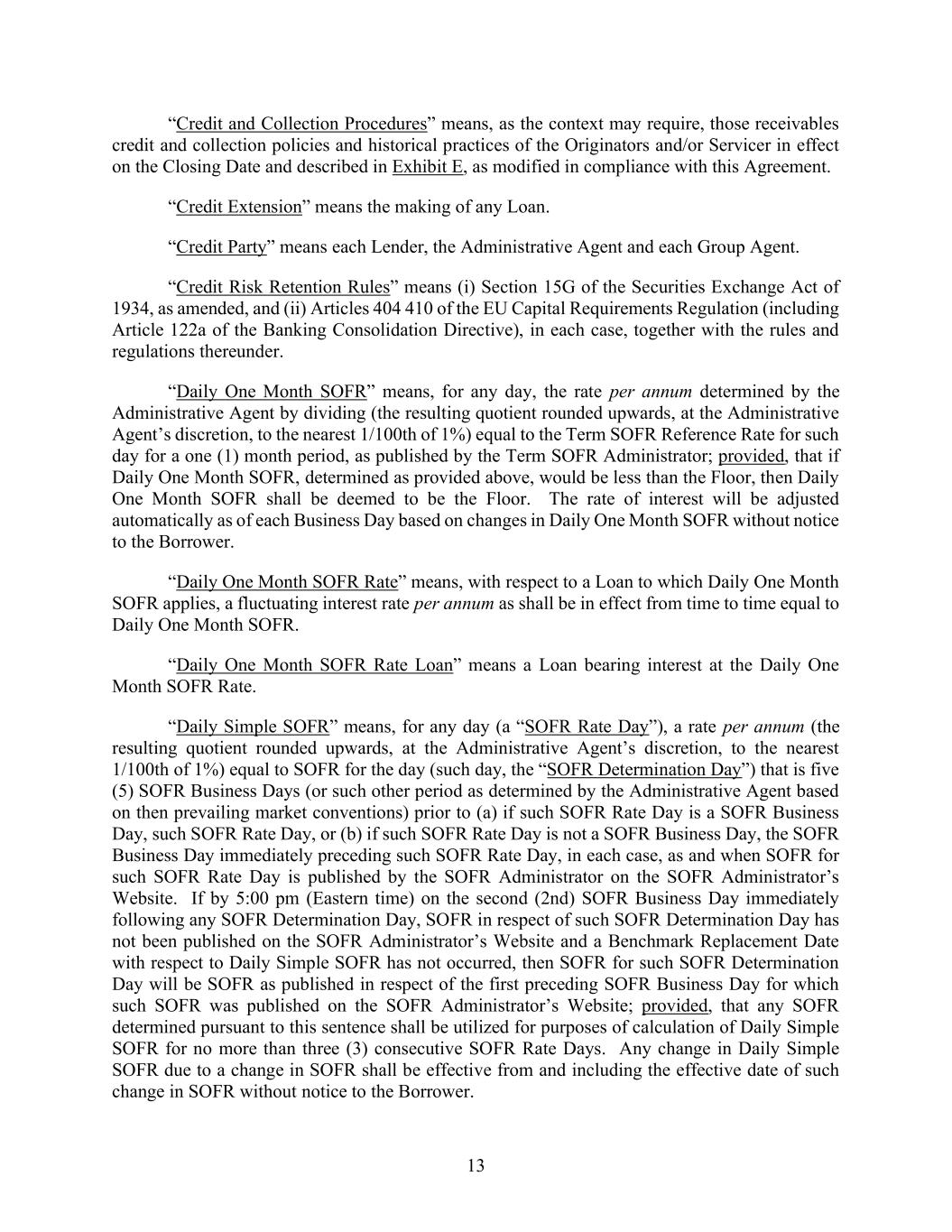 13 “Credit and Collection Procedures” means, as the context may require, those receivables credit and collection policies and historical practices of the Originators and/or Servicer in effect on the Closing Date and described in Exhibit E, as modified in compliance with this Agreement. “Credit Extension” means the making of any Loan. “Credit Party” means each Lender, the Administrative Agent and each Group Agent. “Credit Risk Retention Rules” means (i) Section 15G of the Securities Exchange Act of 1934, as amended, and (ii) Articles 404 410 of the EU Capital Requirements Regulation (including Article 122a of the Banking Consolidation Directive), in each case, together with the rules and regulations thereunder. “Daily One Month SOFR” means, for any day, the rate per annum determined by the Administrative Agent by dividing (the resulting quotient rounded upwards, at the Administrative Agent’s discretion, to the nearest 1/100th of 1%) equal to the Term SOFR Reference Rate for such day for a one (1) month period, as published by the Term SOFR Administrator; provided, that if Daily One Month SOFR, determined as provided above, would be less than the Floor, then Daily One Month SOFR shall be deemed to be the Floor. The rate of interest will be adjusted automatically as of each Business Day based on changes in Daily One Month SOFR without notice to the Borrower. “Daily One Month SOFR Rate” means, with respect to a Loan to which Daily One Month SOFR applies, a fluctuating interest rate per annum as shall be in effect from time to time equal to Daily One Month SOFR. “Daily One Month SOFR Rate Loan” means a Loan bearing interest at the Daily One Month SOFR Rate. “Daily Simple SOFR” means, for any day (a “SOFR Rate Day”), a rate per annum (the resulting quotient rounded upwards, at the Administrative Agent’s discretion, to the nearest 1/100th of 1%) equal to SOFR for the day (such day, the “SOFR Determination Day”) that is five (5) SOFR Business Days (or such other period as determined by the Administrative Agent based on then prevailing market conventions) prior to (a) if such SOFR Rate Day is a SOFR Business Day, such SOFR Rate Day, or (b) if such SOFR Rate Day is not a SOFR Business Day, the SOFR Business Day immediately preceding such SOFR Rate Day, in each case, as and when SOFR for such SOFR Rate Day is published by the SOFR Administrator on the SOFR Administrator’s Website. If by 5:00 pm (Eastern time) on the second (2nd) SOFR Business Day immediately following any SOFR Determination Day, SOFR in respect of such SOFR Determination Day has not been published on the SOFR Administrator’s Website and a Benchmark Replacement Date with respect to Daily Simple SOFR has not occurred, then SOFR for such SOFR Determination Day will be SOFR as published in respect of the first preceding SOFR Business Day for which such SOFR was published on the SOFR Administrator’s Website; provided, that any SOFR determined pursuant to this sentence shall be utilized for purposes of calculation of Daily Simple SOFR for no more than three (3) consecutive SOFR Rate Days. Any change in Daily Simple SOFR due to a change in SOFR shall be effective from and including the effective date of such change in SOFR without notice to the Borrower.
