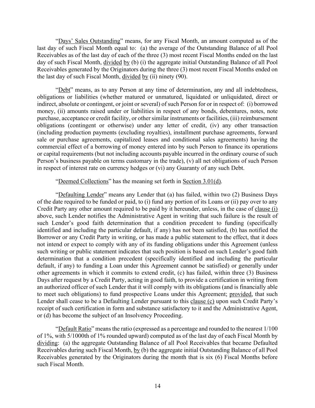14 “Days’ Sales Outstanding” means, for any Fiscal Month, an amount computed as of the last day of such Fiscal Month equal to: (a) the average of the Outstanding Balance of all Pool Receivables as of the last day of each of the three (3) most recent Fiscal Months ended on the last day of such Fiscal Month, divided by (b) (i) the aggregate initial Outstanding Balance of all Pool Receivables generated by the Originators during the three (3) most recent Fiscal Months ended on the last day of such Fiscal Month, divided by (ii) ninety (90). “Debt” means, as to any Person at any time of determination, any and all indebtedness, obligations or liabilities (whether matured or unmatured, liquidated or unliquidated, direct or indirect, absolute or contingent, or joint or several) of such Person for or in respect of: (i) borrowed money, (ii) amounts raised under or liabilities in respect of any bonds, debentures, notes, note purchase, acceptance or credit facility, or other similar instruments or facilities, (iii) reimbursement obligations (contingent or otherwise) under any letter of credit, (iv) any other transaction (including production payments (excluding royalties), installment purchase agreements, forward sale or purchase agreements, capitalized leases and conditional sales agreements) having the commercial effect of a borrowing of money entered into by such Person to finance its operations or capital requirements (but not including accounts payable incurred in the ordinary course of such Person’s business payable on terms customary in the trade), (v) all net obligations of such Person in respect of interest rate on currency hedges or (vi) any Guaranty of any such Debt. “Deemed Collections” has the meaning set forth in Section 3.01(d). “Defaulting Lender” means any Lender that (a) has failed, within two (2) Business Days of the date required to be funded or paid, to (i) fund any portion of its Loans or (ii) pay over to any Credit Party any other amount required to be paid by it hereunder, unless, in the case of clause (i) above, such Lender notifies the Administrative Agent in writing that such failure is the result of such Lender’s good faith determination that a condition precedent to funding (specifically identified and including the particular default, if any) has not been satisfied, (b) has notified the Borrower or any Credit Party in writing, or has made a public statement to the effect, that it does not intend or expect to comply with any of its funding obligations under this Agreement (unless such writing or public statement indicates that such position is based on such Lender’s good faith determination that a condition precedent (specifically identified and including the particular default, if any) to funding a Loan under this Agreement cannot be satisfied) or generally under other agreements in which it commits to extend credit, (c) has failed, within three (3) Business Days after request by a Credit Party, acting in good faith, to provide a certification in writing from an authorized officer of such Lender that it will comply with its obligations (and is financially able to meet such obligations) to fund prospective Loans under this Agreement; provided, that such Lender shall cease to be a Defaulting Lender pursuant to this clause (c) upon such Credit Party’s receipt of such certification in form and substance satisfactory to it and the Administrative Agent, or (d) has become the subject of an Insolvency Proceeding. “Default Ratio” means the ratio (expressed as a percentage and rounded to the nearest 1/100 of 1%, with 5/1000th of 1% rounded upward) computed as of the last day of each Fiscal Month by dividing: (a) the aggregate Outstanding Balance of all Pool Receivables that became Defaulted Receivables during such Fiscal Month, by (b) the aggregate initial Outstanding Balance of all Pool Receivables generated by the Originators during the month that is six (6) Fiscal Months before such Fiscal Month.