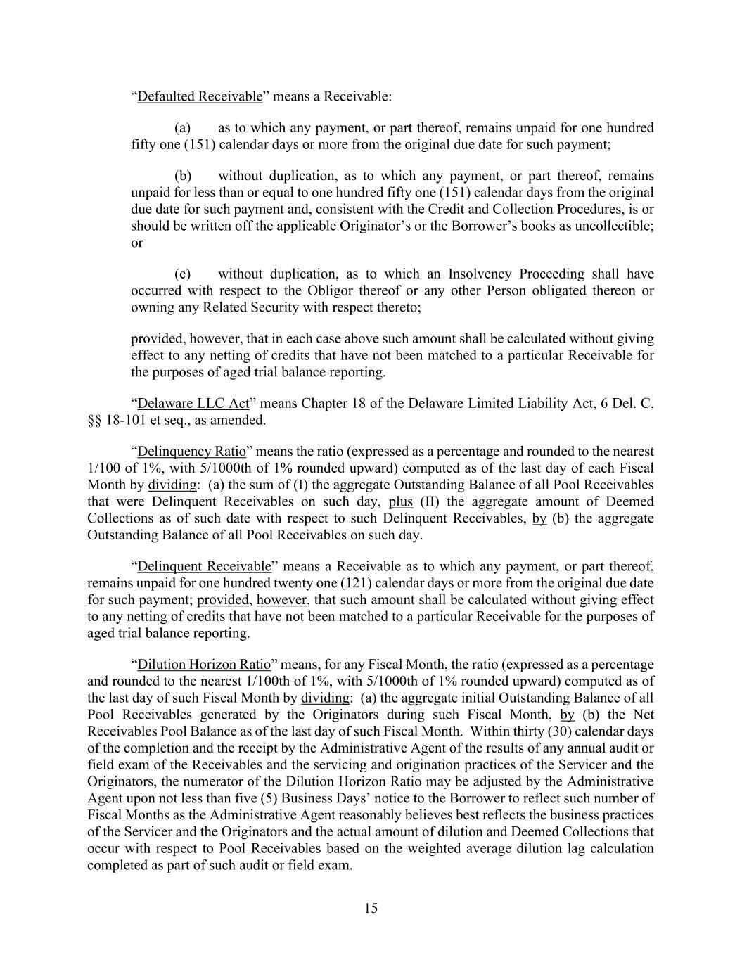 15 “Defaulted Receivable” means a Receivable: (a) as to which any payment, or part thereof, remains unpaid for one hundred fifty one (151) calendar days or more from the original due date for such payment; (b) without duplication, as to which any payment, or part thereof, remains unpaid for less than or equal to one hundred fifty one (151) calendar days from the original due date for such payment and, consistent with the Credit and Collection Procedures, is or should be written off the applicable Originator’s or the Borrower’s books as uncollectible; or (c) without duplication, as to which an Insolvency Proceeding shall have occurred with respect to the Obligor thereof or any other Person obligated thereon or owning any Related Security with respect thereto; provided, however, that in each case above such amount shall be calculated without giving effect to any netting of credits that have not been matched to a particular Receivable for the purposes of aged trial balance reporting. “Delaware LLC Act” means Chapter 18 of the Delaware Limited Liability Act, 6 Del. C. §§ 18-101 et seq., as amended. “Delinquency Ratio” means the ratio (expressed as a percentage and rounded to the nearest 1/100 of 1%, with 5/1000th of 1% rounded upward) computed as of the last day of each Fiscal Month by dividing: (a) the sum of (I) the aggregate Outstanding Balance of all Pool Receivables that were Delinquent Receivables on such day, plus (II) the aggregate amount of Deemed Collections as of such date with respect to such Delinquent Receivables, by (b) the aggregate Outstanding Balance of all Pool Receivables on such day. “Delinquent Receivable” means a Receivable as to which any payment, or part thereof, remains unpaid for one hundred twenty one (121) calendar days or more from the original due date for such payment; provided, however, that such amount shall be calculated without giving effect to any netting of credits that have not been matched to a particular Receivable for the purposes of aged trial balance reporting. “Dilution Horizon Ratio” means, for any Fiscal Month, the ratio (expressed as a percentage and rounded to the nearest 1/100th of 1%, with 5/1000th of 1% rounded upward) computed as of the last day of such Fiscal Month by dividing: (a) the aggregate initial Outstanding Balance of all Pool Receivables generated by the Originators during such Fiscal Month, by (b) the Net Receivables Pool Balance as of the last day of such Fiscal Month. Within thirty (30) calendar days of the completion and the receipt by the Administrative Agent of the results of any annual audit or field exam of the Receivables and the servicing and origination practices of the Servicer and the Originators, the numerator of the Dilution Horizon Ratio may be adjusted by the Administrative Agent upon not less than five (5) Business Days’ notice to the Borrower to reflect such number of Fiscal Months as the Administrative Agent reasonably believes best reflects the business practices of the Servicer and the Originators and the actual amount of dilution and Deemed Collections that occur with respect to Pool Receivables based on the weighted average dilution lag calculation completed as part of such audit or field exam.