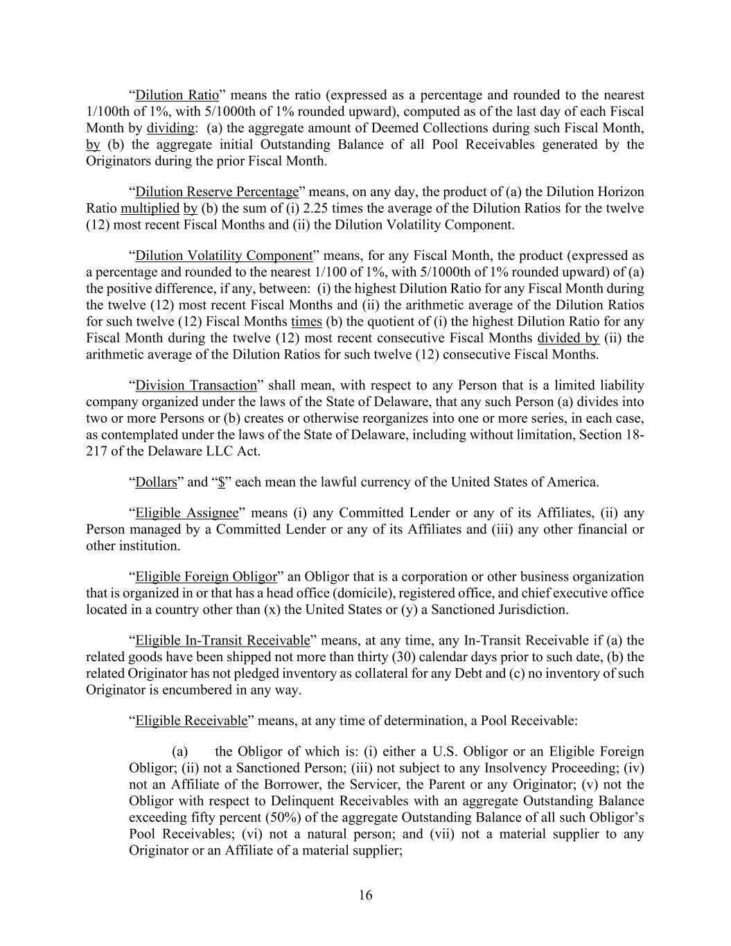 16 “Dilution Ratio” means the ratio (expressed as a percentage and rounded to the nearest 1/100th of 1%, with 5/1000th of 1% rounded upward), computed as of the last day of each Fiscal Month by dividing: (a) the aggregate amount of Deemed Collections during such Fiscal Month, by (b) the aggregate initial Outstanding Balance of all Pool Receivables generated by the Originators during the prior Fiscal Month. “Dilution Reserve Percentage” means, on any day, the product of (a) the Dilution Horizon Ratio multiplied by (b) the sum of (i) 2.25 times the average of the Dilution Ratios for the twelve (12) most recent Fiscal Months and (ii) the Dilution Volatility Component. “Dilution Volatility Component” means, for any Fiscal Month, the product (expressed as a percentage and rounded to the nearest 1/100 of 1%, with 5/1000th of 1% rounded upward) of (a) the positive difference, if any, between: (i) the highest Dilution Ratio for any Fiscal Month during the twelve (12) most recent Fiscal Months and (ii) the arithmetic average of the Dilution Ratios for such twelve (12) Fiscal Months times (b) the quotient of (i) the highest Dilution Ratio for any Fiscal Month during the twelve (12) most recent consecutive Fiscal Months divided by (ii) the arithmetic average of the Dilution Ratios for such twelve (12) consecutive Fiscal Months. “Division Transaction” shall mean, with respect to any Person that is a limited liability company organized under the laws of the State of Delaware, that any such Person (a) divides into two or more Persons or (b) creates or otherwise reorganizes into one or more series, in each case, as contemplated under the laws of the State of Delaware, including without limitation, Section 18- 217 of the Delaware LLC Act. “Dollars” and “$” each mean the lawful currency of the United States of America. “Eligible Assignee” means (i) any Committed Lender or any of its Affiliates, (ii) any Person managed by a Committed Lender or any of its Affiliates and (iii) any other financial or other institution. “Eligible Foreign Obligor” an Obligor that is a corporation or other business organization that is organized in or that has a head office (domicile), registered office, and chief executive office located in a country other than (x) the United States or (y) a Sanctioned Jurisdiction. “Eligible In-Transit Receivable” means, at any time, any In-Transit Receivable if (a) the related goods have been shipped not more than thirty (30) calendar days prior to such date, (b) the related Originator has not pledged inventory as collateral for any Debt and (c) no inventory of such Originator is encumbered in any way. “Eligible Receivable” means, at any time of determination, a Pool Receivable: (a) the Obligor of which is: (i) either a U.S. Obligor or an Eligible Foreign Obligor; (ii) not a Sanctioned Person; (iii) not subject to any Insolvency Proceeding; (iv) not an Affiliate of the Borrower, the Servicer, the Parent or any Originator; (v) not the Obligor with respect to Delinquent Receivables with an aggregate Outstanding Balance exceeding fifty percent (50%) of the aggregate Outstanding Balance of all such Obligor’s Pool Receivables; (vi) not a natural person; and (vii) not a material supplier to any Originator or an Affiliate of a material supplier;