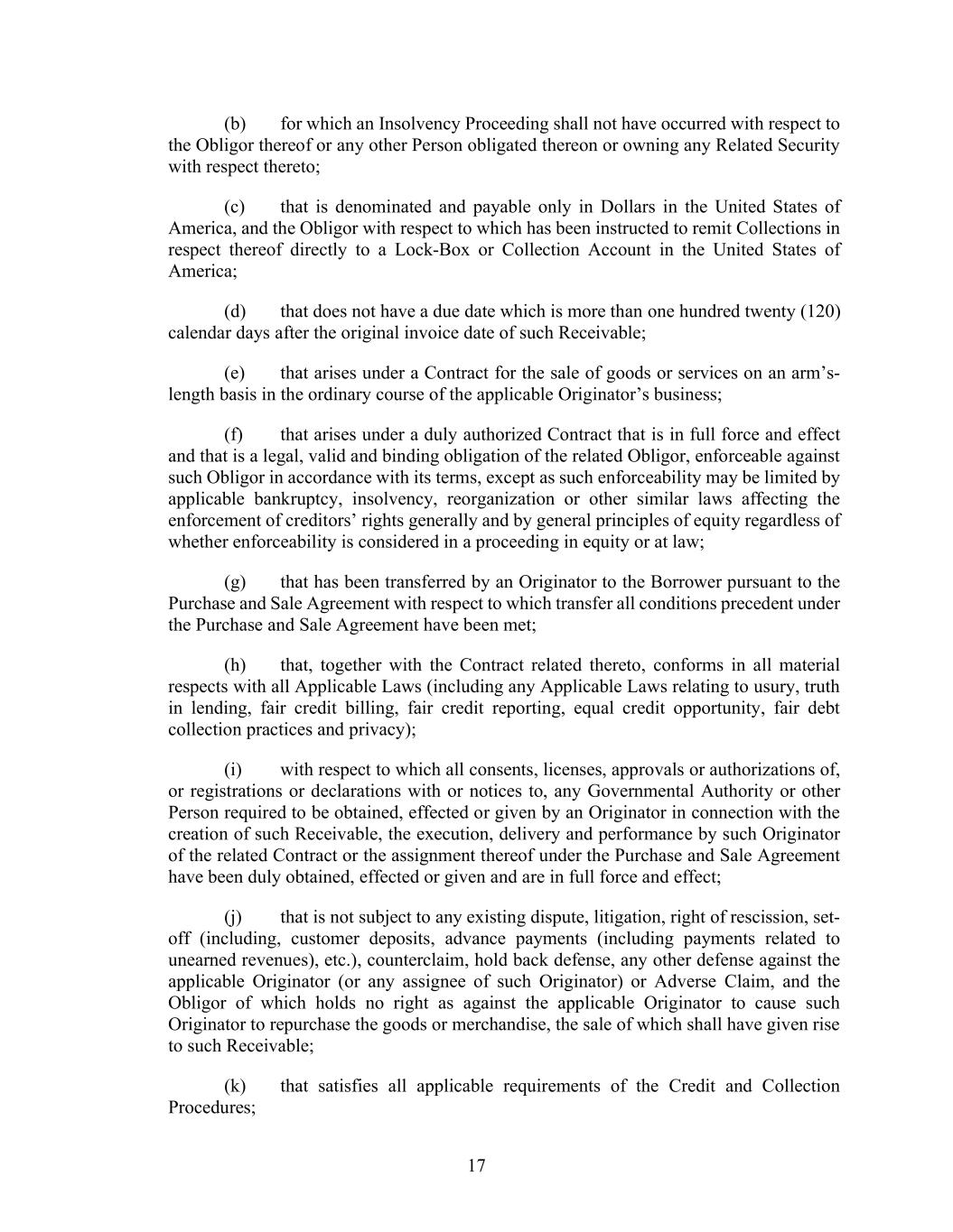 17 (b) for which an Insolvency Proceeding shall not have occurred with respect to the Obligor thereof or any other Person obligated thereon or owning any Related Security with respect thereto; (c) that is denominated and payable only in Dollars in the United States of America, and the Obligor with respect to which has been instructed to remit Collections in respect thereof directly to a Lock-Box or Collection Account in the United States of America; (d) that does not have a due date which is more than one hundred twenty (120) calendar days after the original invoice date of such Receivable; (e) that arises under a Contract for the sale of goods or services on an arm’s- length basis in the ordinary course of the applicable Originator’s business; (f) that arises under a duly authorized Contract that is in full force and effect and that is a legal, valid and binding obligation of the related Obligor, enforceable against such Obligor in accordance with its terms, except as such enforceability may be limited by applicable bankruptcy, insolvency, reorganization or other similar laws affecting the enforcement of creditors’ rights generally and by general principles of equity regardless of whether enforceability is considered in a proceeding in equity or at law; (g) that has been transferred by an Originator to the Borrower pursuant to the Purchase and Sale Agreement with respect to which transfer all conditions precedent under the Purchase and Sale Agreement have been met; (h) that, together with the Contract related thereto, conforms in all material respects with all Applicable Laws (including any Applicable Laws relating to usury, truth in lending, fair credit billing, fair credit reporting, equal credit opportunity, fair debt collection practices and privacy); (i) with respect to which all consents, licenses, approvals or authorizations of, or registrations or declarations with or notices to, any Governmental Authority or other Person required to be obtained, effected or given by an Originator in connection with the creation of such Receivable, the execution, delivery and performance by such Originator of the related Contract or the assignment thereof under the Purchase and Sale Agreement have been duly obtained, effected or given and are in full force and effect; (j) that is not subject to any existing dispute, litigation, right of rescission, set- off (including, customer deposits, advance payments (including payments related to unearned revenues), etc.), counterclaim, hold back defense, any other defense against the applicable Originator (or any assignee of such Originator) or Adverse Claim, and the Obligor of which holds no right as against the applicable Originator to cause such Originator to repurchase the goods or merchandise, the sale of which shall have given rise to such Receivable; (k) that satisfies all applicable requirements of the Credit and Collection Procedures;