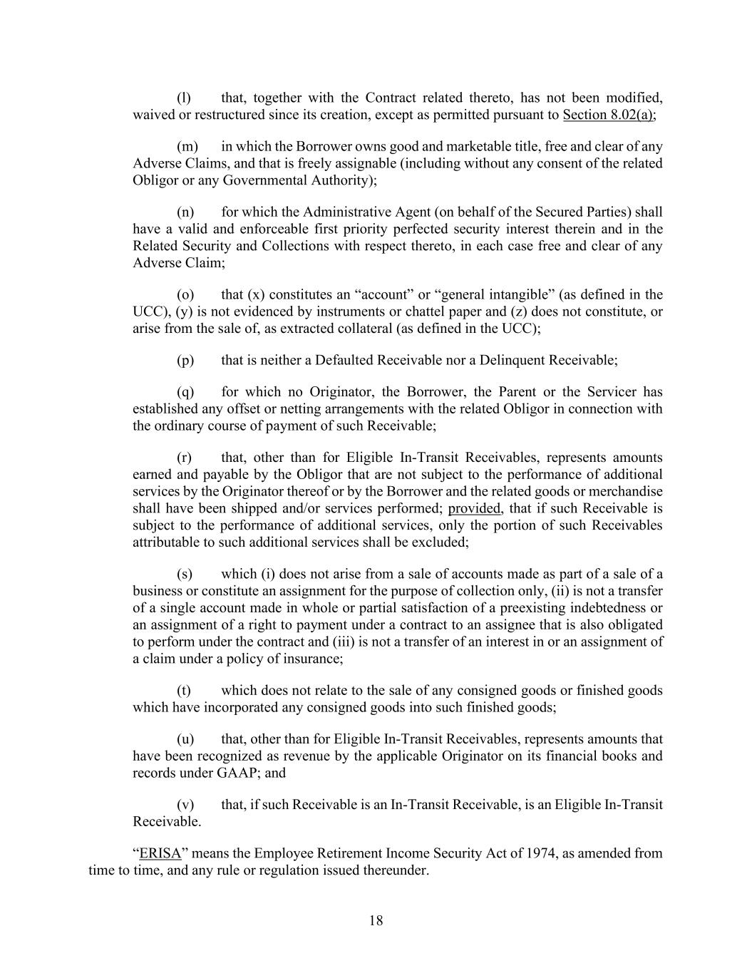 18 (l) that, together with the Contract related thereto, has not been modified, waived or restructured since its creation, except as permitted pursuant to Section 8.02(a); (m) in which the Borrower owns good and marketable title, free and clear of any Adverse Claims, and that is freely assignable (including without any consent of the related Obligor or any Governmental Authority); (n) for which the Administrative Agent (on behalf of the Secured Parties) shall have a valid and enforceable first priority perfected security interest therein and in the Related Security and Collections with respect thereto, in each case free and clear of any Adverse Claim; (o) that (x) constitutes an “account” or “general intangible” (as defined in the UCC), (y) is not evidenced by instruments or chattel paper and (z) does not constitute, or arise from the sale of, as extracted collateral (as defined in the UCC); (p) that is neither a Defaulted Receivable nor a Delinquent Receivable; (q) for which no Originator, the Borrower, the Parent or the Servicer has established any offset or netting arrangements with the related Obligor in connection with the ordinary course of payment of such Receivable; (r) that, other than for Eligible In-Transit Receivables, represents amounts earned and payable by the Obligor that are not subject to the performance of additional services by the Originator thereof or by the Borrower and the related goods or merchandise shall have been shipped and/or services performed; provided, that if such Receivable is subject to the performance of additional services, only the portion of such Receivables attributable to such additional services shall be excluded; (s) which (i) does not arise from a sale of accounts made as part of a sale of a business or constitute an assignment for the purpose of collection only, (ii) is not a transfer of a single account made in whole or partial satisfaction of a preexisting indebtedness or an assignment of a right to payment under a contract to an assignee that is also obligated to perform under the contract and (iii) is not a transfer of an interest in or an assignment of a claim under a policy of insurance; (t) which does not relate to the sale of any consigned goods or finished goods which have incorporated any consigned goods into such finished goods; (u) that, other than for Eligible In-Transit Receivables, represents amounts that have been recognized as revenue by the applicable Originator on its financial books and records under GAAP; and (v) that, if such Receivable is an In-Transit Receivable, is an Eligible In-Transit Receivable. “ERISA” means the Employee Retirement Income Security Act of 1974, as amended from time to time, and any rule or regulation issued thereunder.