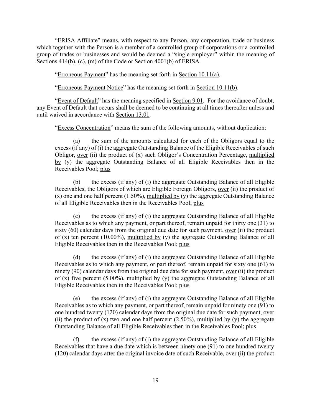 19 “ERISA Affiliate” means, with respect to any Person, any corporation, trade or business which together with the Person is a member of a controlled group of corporations or a controlled group of trades or businesses and would be deemed a “single employer” within the meaning of Sections 414(b), (c), (m) of the Code or Section 4001(b) of ERISA. “Erroneous Payment” has the meaning set forth in Section 10.11(a). “Erroneous Payment Notice” has the meaning set forth in Section 10.11(b). “Event of Default” has the meaning specified in Section 9.01. For the avoidance of doubt, any Event of Default that occurs shall be deemed to be continuing at all times thereafter unless and until waived in accordance with Section 13.01. “Excess Concentration” means the sum of the following amounts, without duplication: (a) the sum of the amounts calculated for each of the Obligors equal to the excess (if any) of (i) the aggregate Outstanding Balance of the Eligible Receivables of such Obligor, over (ii) the product of (x) such Obligor’s Concentration Percentage, multiplied by (y) the aggregate Outstanding Balance of all Eligible Receivables then in the Receivables Pool; plus (b) the excess (if any) of (i) the aggregate Outstanding Balance of all Eligible Receivables, the Obligors of which are Eligible Foreign Obligors, over (ii) the product of (x) one and one half percent (1.50%), multiplied by (y) the aggregate Outstanding Balance of all Eligible Receivables then in the Receivables Pool; plus (c) the excess (if any) of (i) the aggregate Outstanding Balance of all Eligible Receivables as to which any payment, or part thereof, remain unpaid for thirty one (31) to sixty (60) calendar days from the original due date for such payment, over (ii) the product of (x) ten percent (10.00%), multiplied by (y) the aggregate Outstanding Balance of all Eligible Receivables then in the Receivables Pool; plus (d) the excess (if any) of (i) the aggregate Outstanding Balance of all Eligible Receivables as to which any payment, or part thereof, remain unpaid for sixty one (61) to ninety (90) calendar days from the original due date for such payment, over (ii) the product of (x) five percent (5.00%), multiplied by (y) the aggregate Outstanding Balance of all Eligible Receivables then in the Receivables Pool; plus (e) the excess (if any) of (i) the aggregate Outstanding Balance of all Eligible Receivables as to which any payment, or part thereof, remain unpaid for ninety one (91) to one hundred twenty (120) calendar days from the original due date for such payment, over (ii) the product of (x) two and one half percent (2.50%), multiplied by (y) the aggregate Outstanding Balance of all Eligible Receivables then in the Receivables Pool; plus (f) the excess (if any) of (i) the aggregate Outstanding Balance of all Eligible Receivables that have a due date which is between ninety one (91) to one hundred twenty (120) calendar days after the original invoice date of such Receivable, over (ii) the product