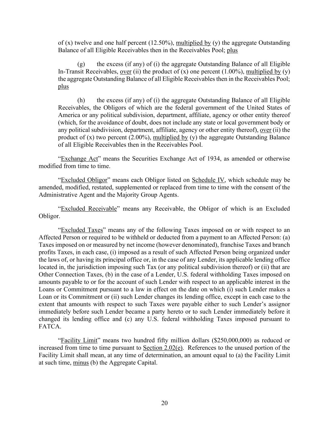 20 of (x) twelve and one half percent (12.50%), multiplied by (y) the aggregate Outstanding Balance of all Eligible Receivables then in the Receivables Pool; plus (g) the excess (if any) of (i) the aggregate Outstanding Balance of all Eligible In-Transit Receivables, over (ii) the product of (x) one percent (1.00%), multiplied by (y) the aggregate Outstanding Balance of all Eligible Receivables then in the Receivables Pool; plus (h) the excess (if any) of (i) the aggregate Outstanding Balance of all Eligible Receivables, the Obligors of which are the federal government of the United States of America or any political subdivision, department, affiliate, agency or other entity thereof (which, for the avoidance of doubt, does not include any state or local government body or any political subdivision, department, affiliate, agency or other entity thereof), over (ii) the product of (x) two percent (2.00%), multiplied by (y) the aggregate Outstanding Balance of all Eligible Receivables then in the Receivables Pool. “Exchange Act” means the Securities Exchange Act of 1934, as amended or otherwise modified from time to time. “Excluded Obligor” means each Obligor listed on Schedule IV, which schedule may be amended, modified, restated, supplemented or replaced from time to time with the consent of the Administrative Agent and the Majority Group Agents. “Excluded Receivable” means any Receivable, the Obligor of which is an Excluded Obligor. “Excluded Taxes” means any of the following Taxes imposed on or with respect to an Affected Person or required to be withheld or deducted from a payment to an Affected Person: (a) Taxes imposed on or measured by net income (however denominated), franchise Taxes and branch profits Taxes, in each case, (i) imposed as a result of such Affected Person being organized under the laws of, or having its principal office or, in the case of any Lender, its applicable lending office located in, the jurisdiction imposing such Tax (or any political subdivision thereof) or (ii) that are Other Connection Taxes, (b) in the case of a Lender, U.S. federal withholding Taxes imposed on amounts payable to or for the account of such Lender with respect to an applicable interest in the Loans or Commitment pursuant to a law in effect on the date on which (i) such Lender makes a Loan or its Commitment or (ii) such Lender changes its lending office, except in each case to the extent that amounts with respect to such Taxes were payable either to such Lender’s assignor immediately before such Lender became a party hereto or to such Lender immediately before it changed its lending office and (c) any U.S. federal withholding Taxes imposed pursuant to FATCA. “Facility Limit” means two hundred fifty million dollars ($250,000,000) as reduced or increased from time to time pursuant to Section 2.02(e). References to the unused portion of the Facility Limit shall mean, at any time of determination, an amount equal to (a) the Facility Limit at such time, minus (b) the Aggregate Capital.
