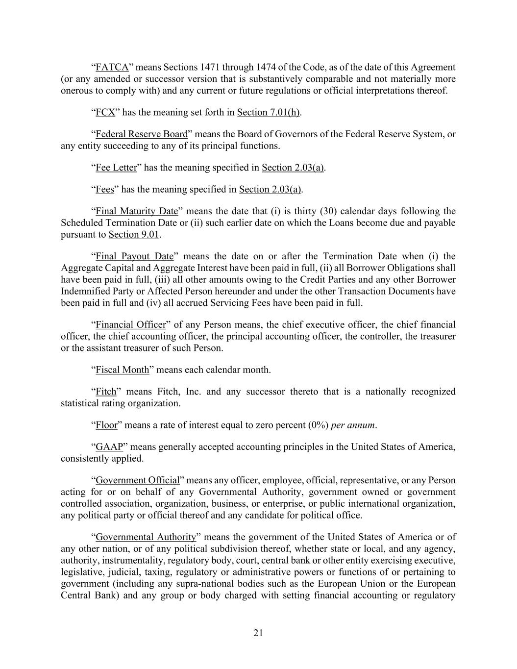 21 “FATCA” means Sections 1471 through 1474 of the Code, as of the date of this Agreement (or any amended or successor version that is substantively comparable and not materially more onerous to comply with) and any current or future regulations or official interpretations thereof. “FCX” has the meaning set forth in Section 7.01(h). “Federal Reserve Board” means the Board of Governors of the Federal Reserve System, or any entity succeeding to any of its principal functions. “Fee Letter” has the meaning specified in Section 2.03(a). “Fees” has the meaning specified in Section 2.03(a). “Final Maturity Date” means the date that (i) is thirty (30) calendar days following the Scheduled Termination Date or (ii) such earlier date on which the Loans become due and payable pursuant to Section 9.01. “Final Payout Date” means the date on or after the Termination Date when (i) the Aggregate Capital and Aggregate Interest have been paid in full, (ii) all Borrower Obligations shall have been paid in full, (iii) all other amounts owing to the Credit Parties and any other Borrower Indemnified Party or Affected Person hereunder and under the other Transaction Documents have been paid in full and (iv) all accrued Servicing Fees have been paid in full. “Financial Officer” of any Person means, the chief executive officer, the chief financial officer, the chief accounting officer, the principal accounting officer, the controller, the treasurer or the assistant treasurer of such Person. “Fiscal Month” means each calendar month. “Fitch” means Fitch, Inc. and any successor thereto that is a nationally recognized statistical rating organization. “Floor” means a rate of interest equal to zero percent (0%) per annum. “GAAP” means generally accepted accounting principles in the United States of America, consistently applied. “Government Official” means any officer, employee, official, representative, or any Person acting for or on behalf of any Governmental Authority, government owned or government controlled association, organization, business, or enterprise, or public international organization, any political party or official thereof and any candidate for political office. “Governmental Authority” means the government of the United States of America or of any other nation, or of any political subdivision thereof, whether state or local, and any agency, authority, instrumentality, regulatory body, court, central bank or other entity exercising executive, legislative, judicial, taxing, regulatory or administrative powers or functions of or pertaining to government (including any supra-national bodies such as the European Union or the European Central Bank) and any group or body charged with setting financial accounting or regulatory