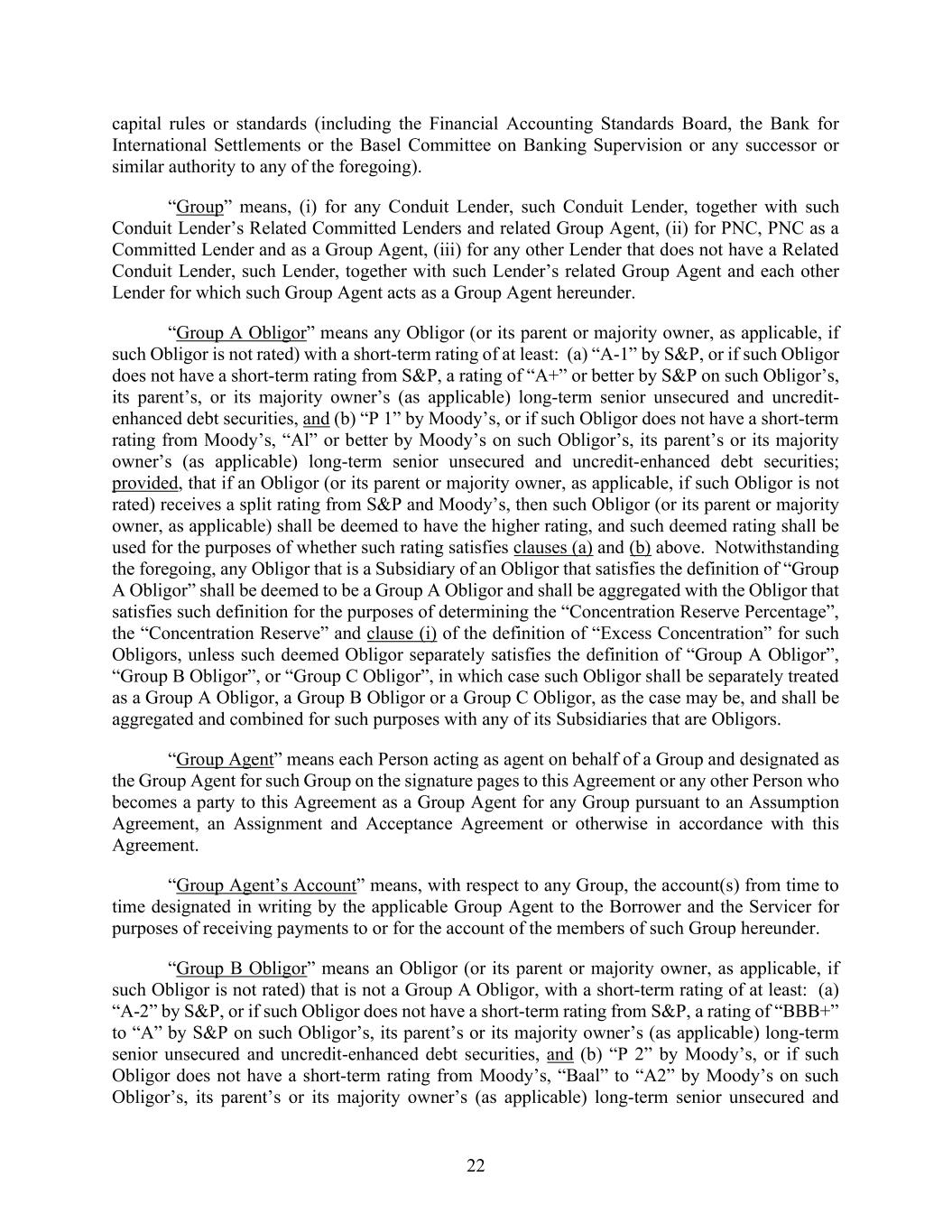 22 capital rules or standards (including the Financial Accounting Standards Board, the Bank for International Settlements or the Basel Committee on Banking Supervision or any successor or similar authority to any of the foregoing). “Group” means, (i) for any Conduit Lender, such Conduit Lender, together with such Conduit Lender’s Related Committed Lenders and related Group Agent, (ii) for PNC, PNC as a Committed Lender and as a Group Agent, (iii) for any other Lender that does not have a Related Conduit Lender, such Lender, together with such Lender’s related Group Agent and each other Lender for which such Group Agent acts as a Group Agent hereunder. “Group A Obligor” means any Obligor (or its parent or majority owner, as applicable, if such Obligor is not rated) with a short-term rating of at least: (a) “A-1” by S&P, or if such Obligor does not have a short-term rating from S&P, a rating of “A+” or better by S&P on such Obligor’s, its parent’s, or its majority owner’s (as applicable) long-term senior unsecured and uncredit- enhanced debt securities, and (b) “P 1” by Moody’s, or if such Obligor does not have a short-term rating from Moody’s, “Al” or better by Moody’s on such Obligor’s, its parent’s or its majority owner’s (as applicable) long-term senior unsecured and uncredit-enhanced debt securities; provided, that if an Obligor (or its parent or majority owner, as applicable, if such Obligor is not rated) receives a split rating from S&P and Moody’s, then such Obligor (or its parent or majority owner, as applicable) shall be deemed to have the higher rating, and such deemed rating shall be used for the purposes of whether such rating satisfies clauses (a) and (b) above. Notwithstanding the foregoing, any Obligor that is a Subsidiary of an Obligor that satisfies the definition of “Group A Obligor” shall be deemed to be a Group A Obligor and shall be aggregated with the Obligor that satisfies such definition for the purposes of determining the “Concentration Reserve Percentage”, the “Concentration Reserve” and clause (i) of the definition of “Excess Concentration” for such Obligors, unless such deemed Obligor separately satisfies the definition of “Group A Obligor”, “Group B Obligor”, or “Group C Obligor”, in which case such Obligor shall be separately treated as a Group A Obligor, a Group B Obligor or a Group C Obligor, as the case may be, and shall be aggregated and combined for such purposes with any of its Subsidiaries that are Obligors. “Group Agent” means each Person acting as agent on behalf of a Group and designated as the Group Agent for such Group on the signature pages to this Agreement or any other Person who becomes a party to this Agreement as a Group Agent for any Group pursuant to an Assumption Agreement, an Assignment and Acceptance Agreement or otherwise in accordance with this Agreement. “Group Agent’s Account” means, with respect to any Group, the account(s) from time to time designated in writing by the applicable Group Agent to the Borrower and the Servicer for purposes of receiving payments to or for the account of the members of such Group hereunder. “Group B Obligor” means an Obligor (or its parent or majority owner, as applicable, if such Obligor is not rated) that is not a Group A Obligor, with a short-term rating of at least: (a) “A-2” by S&P, or if such Obligor does not have a short-term rating from S&P, a rating of “BBB+” to “A” by S&P on such Obligor’s, its parent’s or its majority owner’s (as applicable) long-term senior unsecured and uncredit-enhanced debt securities, and (b) “P 2” by Moody’s, or if such Obligor does not have a short-term rating from Moody’s, “Baal” to “A2” by Moody’s on such Obligor’s, its parent’s or its majority owner’s (as applicable) long-term senior unsecured and
