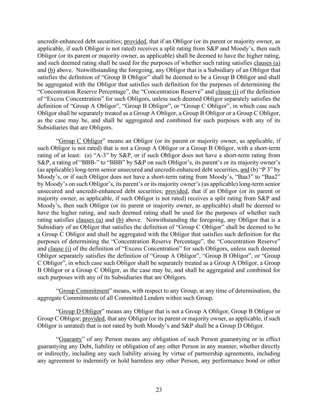 23 uncredit-enhanced debt securities; provided, that if an Obligor (or its parent or majority owner, as applicable, if such Obligor is not rated) receives a split rating from S&P and Moody’s, then such Obligor (or its parent or majority owner, as applicable) shall be deemed to have the higher rating, and such deemed rating shall be used for the purposes of whether such rating satisfies clauses (a) and (b) above. Notwithstanding the foregoing, any Obligor that is a Subsidiary of an Obligor that satisfies the definition of “Group B Obligor” shall be deemed to be a Group B Obligor and shall be aggregated with the Obligor that satisfies such definition for the purposes of determining the “Concentration Reserve Percentage”, the “Concentration Reserve” and clause (i) of the definition of “Excess Concentration” for such Obligors, unless such deemed Obligor separately satisfies the definition of “Group A Obligor”, “Group B Obligor”, or “Group C Obligor”, in which case such Obligor shall be separately treated as a Group A Obligor, a Group B Obligor or a Group C Obligor, as the case may be, and shall be aggregated and combined for such purposes with any of its Subsidiaries that are Obligors. “Group C Obligor” means an Obligor (or its parent or majority owner, as applicable, if such Obligor is not rated) that is not a Group A Obligor or a Group B Obligor, with a short-term rating of at least: (a) “A-3” by S&P, or if such Obligor does not have a short-term rating from S&P, a rating of “BBB-” to “BBB” by S&P on such Obligor’s, its parent’s or its majority owner’s (as applicable) long-term senior unsecured and uncredit-enhanced debt securities, and (b) “P 3” by Moody’s, or if such Obligor does not have a short-term rating from Moody’s, “Baa3” to “Baa2” by Moody’s on such Obligor’s, its parent’s or its majority owner’s (as applicable) long-term senior unsecured and uncredit-enhanced debt securities; provided, that if an Obligor (or its parent or majority owner, as applicable, if such Obligor is not rated) receives a split rating from S&P and Moody’s, then such Obligor (or its parent or majority owner, as applicable) shall be deemed to have the higher rating, and such deemed rating shall be used for the purposes of whether such rating satisfies clauses (a) and (b) above. Notwithstanding the foregoing, any Obligor that is a Subsidiary of an Obligor that satisfies the definition of “Group C Obligor” shall be deemed to be a Group C Obligor and shall be aggregated with the Obligor that satisfies such definition for the purposes of determining the “Concentration Reserve Percentage”, the “Concentration Reserve” and clause (i) of the definition of “Excess Concentration” for such Obligors, unless such deemed Obligor separately satisfies the definition of “Group A Obligor”, “Group B Obligor”, or “Group C Obligor”, in which case such Obligor shall be separately treated as a Group A Obligor, a Group B Obligor or a Group C Obligor, as the case may be, and shall be aggregated and combined for such purposes with any of its Subsidiaries that are Obligors. “Group Commitment” means, with respect to any Group, at any time of determination, the aggregate Commitments of all Committed Lenders within such Group. “Group D Obligor” means any Obligor that is not a Group A Obligor, Group B Obligor or Group C Obligor; provided, that any Obligor (or its parent or majority owner, as applicable, if such Obligor is unrated) that is not rated by both Moody’s and S&P shall be a Group D Obligor. “Guaranty” of any Person means any obligation of such Person guarantying or in effect guarantying any Debt, liability or obligation of any other Person in any manner, whether directly or indirectly, including any such liability arising by virtue of partnership agreements, including any agreement to indemnify or hold harmless any other Person, any performance bond or other