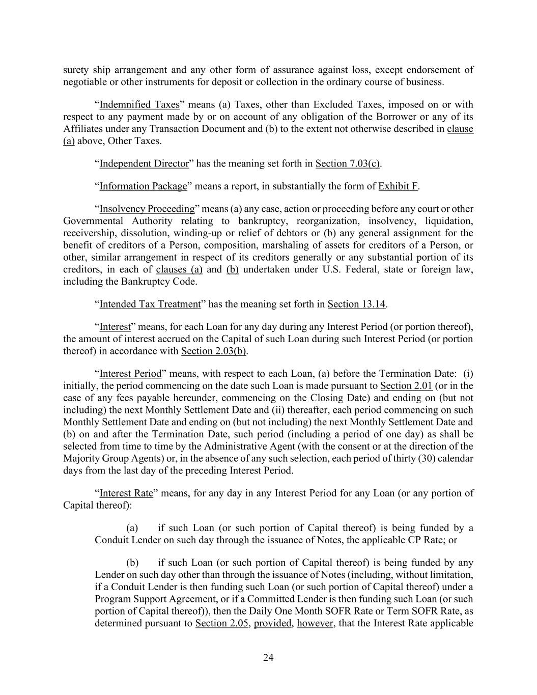 24 surety ship arrangement and any other form of assurance against loss, except endorsement of negotiable or other instruments for deposit or collection in the ordinary course of business. “Indemnified Taxes” means (a) Taxes, other than Excluded Taxes, imposed on or with respect to any payment made by or on account of any obligation of the Borrower or any of its Affiliates under any Transaction Document and (b) to the extent not otherwise described in clause (a) above, Other Taxes. “Independent Director” has the meaning set forth in Section 7.03(c). “Information Package” means a report, in substantially the form of Exhibit F. “Insolvency Proceeding” means (a) any case, action or proceeding before any court or other Governmental Authority relating to bankruptcy, reorganization, insolvency, liquidation, receivership, dissolution, winding-up or relief of debtors or (b) any general assignment for the benefit of creditors of a Person, composition, marshaling of assets for creditors of a Person, or other, similar arrangement in respect of its creditors generally or any substantial portion of its creditors, in each of clauses (a) and (b) undertaken under U.S. Federal, state or foreign law, including the Bankruptcy Code. “Intended Tax Treatment” has the meaning set forth in Section 13.14. “Interest” means, for each Loan for any day during any Interest Period (or portion thereof), the amount of interest accrued on the Capital of such Loan during such Interest Period (or portion thereof) in accordance with Section 2.03(b). “Interest Period” means, with respect to each Loan, (a) before the Termination Date: (i) initially, the period commencing on the date such Loan is made pursuant to Section 2.01 (or in the case of any fees payable hereunder, commencing on the Closing Date) and ending on (but not including) the next Monthly Settlement Date and (ii) thereafter, each period commencing on such Monthly Settlement Date and ending on (but not including) the next Monthly Settlement Date and (b) on and after the Termination Date, such period (including a period of one day) as shall be selected from time to time by the Administrative Agent (with the consent or at the direction of the Majority Group Agents) or, in the absence of any such selection, each period of thirty (30) calendar days from the last day of the preceding Interest Period. “Interest Rate” means, for any day in any Interest Period for any Loan (or any portion of Capital thereof): (a) if such Loan (or such portion of Capital thereof) is being funded by a Conduit Lender on such day through the issuance of Notes, the applicable CP Rate; or (b) if such Loan (or such portion of Capital thereof) is being funded by any Lender on such day other than through the issuance of Notes (including, without limitation, if a Conduit Lender is then funding such Loan (or such portion of Capital thereof) under a Program Support Agreement, or if a Committed Lender is then funding such Loan (or such portion of Capital thereof)), then the Daily One Month SOFR Rate or Term SOFR Rate, as determined pursuant to Section 2.05, provided, however, that the Interest Rate applicable