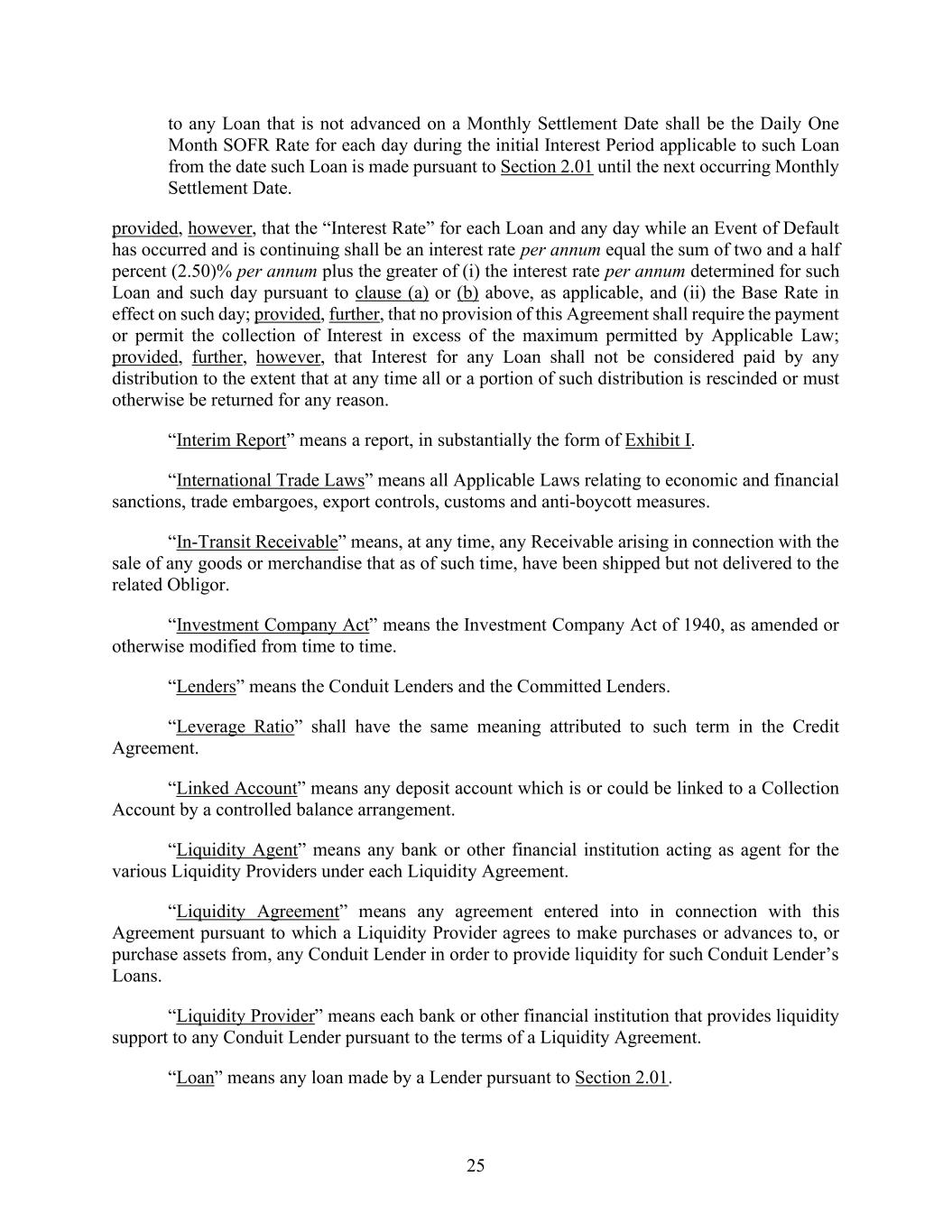 25 to any Loan that is not advanced on a Monthly Settlement Date shall be the Daily One Month SOFR Rate for each day during the initial Interest Period applicable to such Loan from the date such Loan is made pursuant to Section 2.01 until the next occurring Monthly Settlement Date. provided, however, that the “Interest Rate” for each Loan and any day while an Event of Default has occurred and is continuing shall be an interest rate per annum equal the sum of two and a half percent (2.50)% per annum plus the greater of (i) the interest rate per annum determined for such Loan and such day pursuant to clause (a) or (b) above, as applicable, and (ii) the Base Rate in effect on such day; provided, further, that no provision of this Agreement shall require the payment or permit the collection of Interest in excess of the maximum permitted by Applicable Law; provided, further, however, that Interest for any Loan shall not be considered paid by any distribution to the extent that at any time all or a portion of such distribution is rescinded or must otherwise be returned for any reason. “Interim Report” means a report, in substantially the form of Exhibit I. “International Trade Laws” means all Applicable Laws relating to economic and financial sanctions, trade embargoes, export controls, customs and anti-boycott measures. “In-Transit Receivable” means, at any time, any Receivable arising in connection with the sale of any goods or merchandise that as of such time, have been shipped but not delivered to the related Obligor. “Investment Company Act” means the Investment Company Act of 1940, as amended or otherwise modified from time to time. “Lenders” means the Conduit Lenders and the Committed Lenders. “Leverage Ratio” shall have the same meaning attributed to such term in the Credit Agreement. “Linked Account” means any deposit account which is or could be linked to a Collection Account by a controlled balance arrangement. “Liquidity Agent” means any bank or other financial institution acting as agent for the various Liquidity Providers under each Liquidity Agreement. “Liquidity Agreement” means any agreement entered into in connection with this Agreement pursuant to which a Liquidity Provider agrees to make purchases or advances to, or purchase assets from, any Conduit Lender in order to provide liquidity for such Conduit Lender’s Loans. “Liquidity Provider” means each bank or other financial institution that provides liquidity support to any Conduit Lender pursuant to the terms of a Liquidity Agreement. “Loan” means any loan made by a Lender pursuant to Section 2.01.