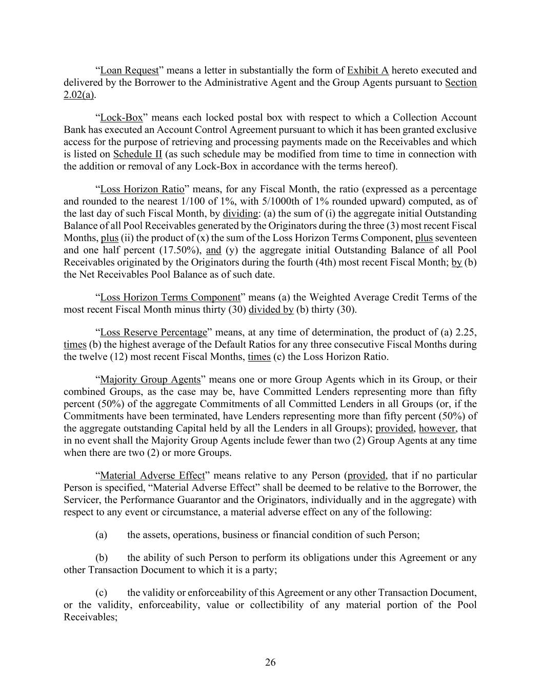 26 “Loan Request” means a letter in substantially the form of Exhibit A hereto executed and delivered by the Borrower to the Administrative Agent and the Group Agents pursuant to Section 2.02(a). “Lock-Box” means each locked postal box with respect to which a Collection Account Bank has executed an Account Control Agreement pursuant to which it has been granted exclusive access for the purpose of retrieving and processing payments made on the Receivables and which is listed on Schedule II (as such schedule may be modified from time to time in connection with the addition or removal of any Lock-Box in accordance with the terms hereof). “Loss Horizon Ratio” means, for any Fiscal Month, the ratio (expressed as a percentage and rounded to the nearest 1/100 of 1%, with 5/1000th of 1% rounded upward) computed, as of the last day of such Fiscal Month, by dividing: (a) the sum of (i) the aggregate initial Outstanding Balance of all Pool Receivables generated by the Originators during the three (3) most recent Fiscal Months, plus (ii) the product of (x) the sum of the Loss Horizon Terms Component, plus seventeen and one half percent (17.50%), and (y) the aggregate initial Outstanding Balance of all Pool Receivables originated by the Originators during the fourth (4th) most recent Fiscal Month; by (b) the Net Receivables Pool Balance as of such date. “Loss Horizon Terms Component” means (a) the Weighted Average Credit Terms of the most recent Fiscal Month minus thirty (30) divided by (b) thirty (30). “Loss Reserve Percentage” means, at any time of determination, the product of (a) 2.25, times (b) the highest average of the Default Ratios for any three consecutive Fiscal Months during the twelve (12) most recent Fiscal Months, times (c) the Loss Horizon Ratio. “Majority Group Agents” means one or more Group Agents which in its Group, or their combined Groups, as the case may be, have Committed Lenders representing more than fifty percent (50%) of the aggregate Commitments of all Committed Lenders in all Groups (or, if the Commitments have been terminated, have Lenders representing more than fifty percent (50%) of the aggregate outstanding Capital held by all the Lenders in all Groups); provided, however, that in no event shall the Majority Group Agents include fewer than two (2) Group Agents at any time when there are two (2) or more Groups. “Material Adverse Effect” means relative to any Person (provided, that if no particular Person is specified, “Material Adverse Effect” shall be deemed to be relative to the Borrower, the Servicer, the Performance Guarantor and the Originators, individually and in the aggregate) with respect to any event or circumstance, a material adverse effect on any of the following: (a) the assets, operations, business or financial condition of such Person; (b) the ability of such Person to perform its obligations under this Agreement or any other Transaction Document to which it is a party; (c) the validity or enforceability of this Agreement or any other Transaction Document, or the validity, enforceability, value or collectibility of any material portion of the Pool Receivables;