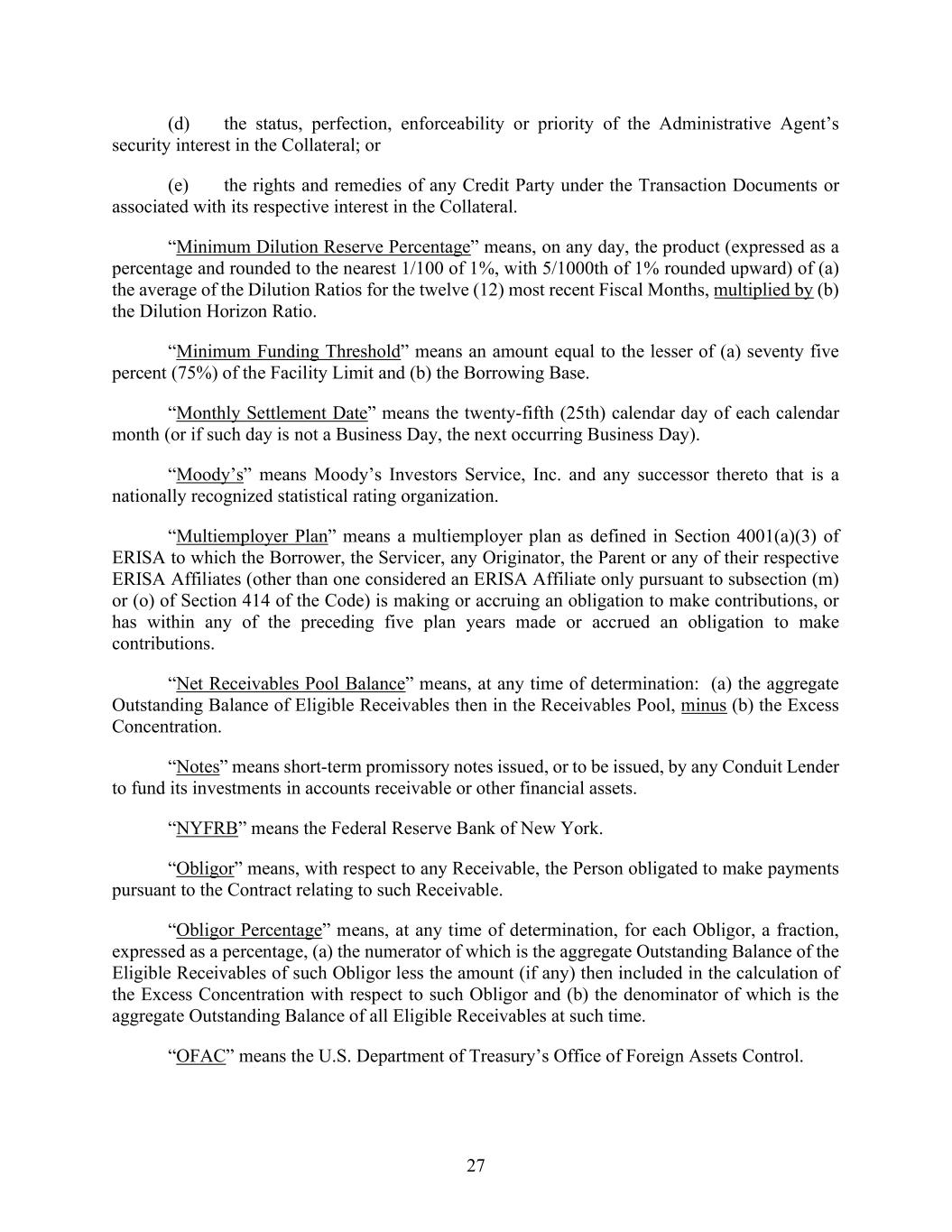 27 (d) the status, perfection, enforceability or priority of the Administrative Agent’s security interest in the Collateral; or (e) the rights and remedies of any Credit Party under the Transaction Documents or associated with its respective interest in the Collateral. “Minimum Dilution Reserve Percentage” means, on any day, the product (expressed as a percentage and rounded to the nearest 1/100 of 1%, with 5/1000th of 1% rounded upward) of (a) the average of the Dilution Ratios for the twelve (12) most recent Fiscal Months, multiplied by (b) the Dilution Horizon Ratio. “Minimum Funding Threshold” means an amount equal to the lesser of (a) seventy five percent (75%) of the Facility Limit and (b) the Borrowing Base. “Monthly Settlement Date” means the twenty-fifth (25th) calendar day of each calendar month (or if such day is not a Business Day, the next occurring Business Day). “Moody’s” means Moody’s Investors Service, Inc. and any successor thereto that is a nationally recognized statistical rating organization. “Multiemployer Plan” means a multiemployer plan as defined in Section 4001(a)(3) of ERISA to which the Borrower, the Servicer, any Originator, the Parent or any of their respective ERISA Affiliates (other than one considered an ERISA Affiliate only pursuant to subsection (m) or (o) of Section 414 of the Code) is making or accruing an obligation to make contributions, or has within any of the preceding five plan years made or accrued an obligation to make contributions. “Net Receivables Pool Balance” means, at any time of determination: (a) the aggregate Outstanding Balance of Eligible Receivables then in the Receivables Pool, minus (b) the Excess Concentration. “Notes” means short-term promissory notes issued, or to be issued, by any Conduit Lender to fund its investments in accounts receivable or other financial assets. “NYFRB” means the Federal Reserve Bank of New York. “Obligor” means, with respect to any Receivable, the Person obligated to make payments pursuant to the Contract relating to such Receivable. “Obligor Percentage” means, at any time of determination, for each Obligor, a fraction, expressed as a percentage, (a) the numerator of which is the aggregate Outstanding Balance of the Eligible Receivables of such Obligor less the amount (if any) then included in the calculation of the Excess Concentration with respect to such Obligor and (b) the denominator of which is the aggregate Outstanding Balance of all Eligible Receivables at such time. “OFAC” means the U.S. Department of Treasury’s Office of Foreign Assets Control.