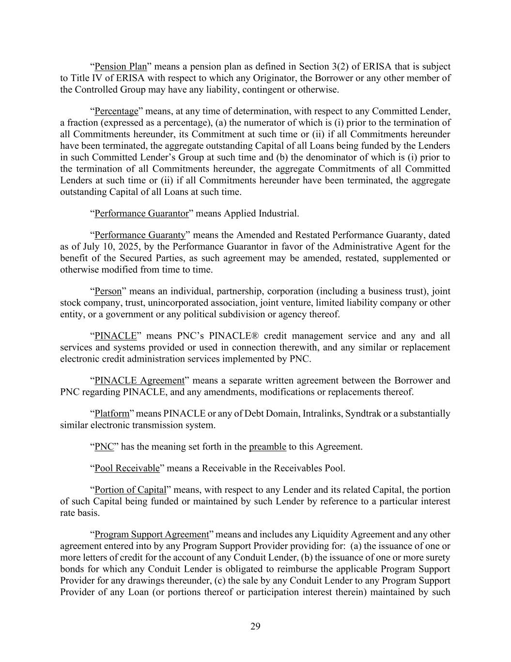 29 “Pension Plan” means a pension plan as defined in Section 3(2) of ERISA that is subject to Title IV of ERISA with respect to which any Originator, the Borrower or any other member of the Controlled Group may have any liability, contingent or otherwise. “Percentage” means, at any time of determination, with respect to any Committed Lender, a fraction (expressed as a percentage), (a) the numerator of which is (i) prior to the termination of all Commitments hereunder, its Commitment at such time or (ii) if all Commitments hereunder have been terminated, the aggregate outstanding Capital of all Loans being funded by the Lenders in such Committed Lender’s Group at such time and (b) the denominator of which is (i) prior to the termination of all Commitments hereunder, the aggregate Commitments of all Committed Lenders at such time or (ii) if all Commitments hereunder have been terminated, the aggregate outstanding Capital of all Loans at such time. “Performance Guarantor” means Applied Industrial. “Performance Guaranty” means the Amended and Restated Performance Guaranty, dated as of July 10, 2025, by the Performance Guarantor in favor of the Administrative Agent for the benefit of the Secured Parties, as such agreement may be amended, restated, supplemented or otherwise modified from time to time. “Person” means an individual, partnership, corporation (including a business trust), joint stock company, trust, unincorporated association, joint venture, limited liability company or other entity, or a government or any political subdivision or agency thereof. “PINACLE” means PNC’s PINACLE® credit management service and any and all services and systems provided or used in connection therewith, and any similar or replacement electronic credit administration services implemented by PNC. “PINACLE Agreement” means a separate written agreement between the Borrower and PNC regarding PINACLE, and any amendments, modifications or replacements thereof. “Platform” means PINACLE or any of Debt Domain, Intralinks, Syndtrak or a substantially similar electronic transmission system. “PNC” has the meaning set forth in the preamble to this Agreement. “Pool Receivable” means a Receivable in the Receivables Pool. “Portion of Capital” means, with respect to any Lender and its related Capital, the portion of such Capital being funded or maintained by such Lender by reference to a particular interest rate basis. “Program Support Agreement” means and includes any Liquidity Agreement and any other agreement entered into by any Program Support Provider providing for: (a) the issuance of one or more letters of credit for the account of any Conduit Lender, (b) the issuance of one or more surety bonds for which any Conduit Lender is obligated to reimburse the applicable Program Support Provider for any drawings thereunder, (c) the sale by any Conduit Lender to any Program Support Provider of any Loan (or portions thereof or participation interest therein) maintained by such