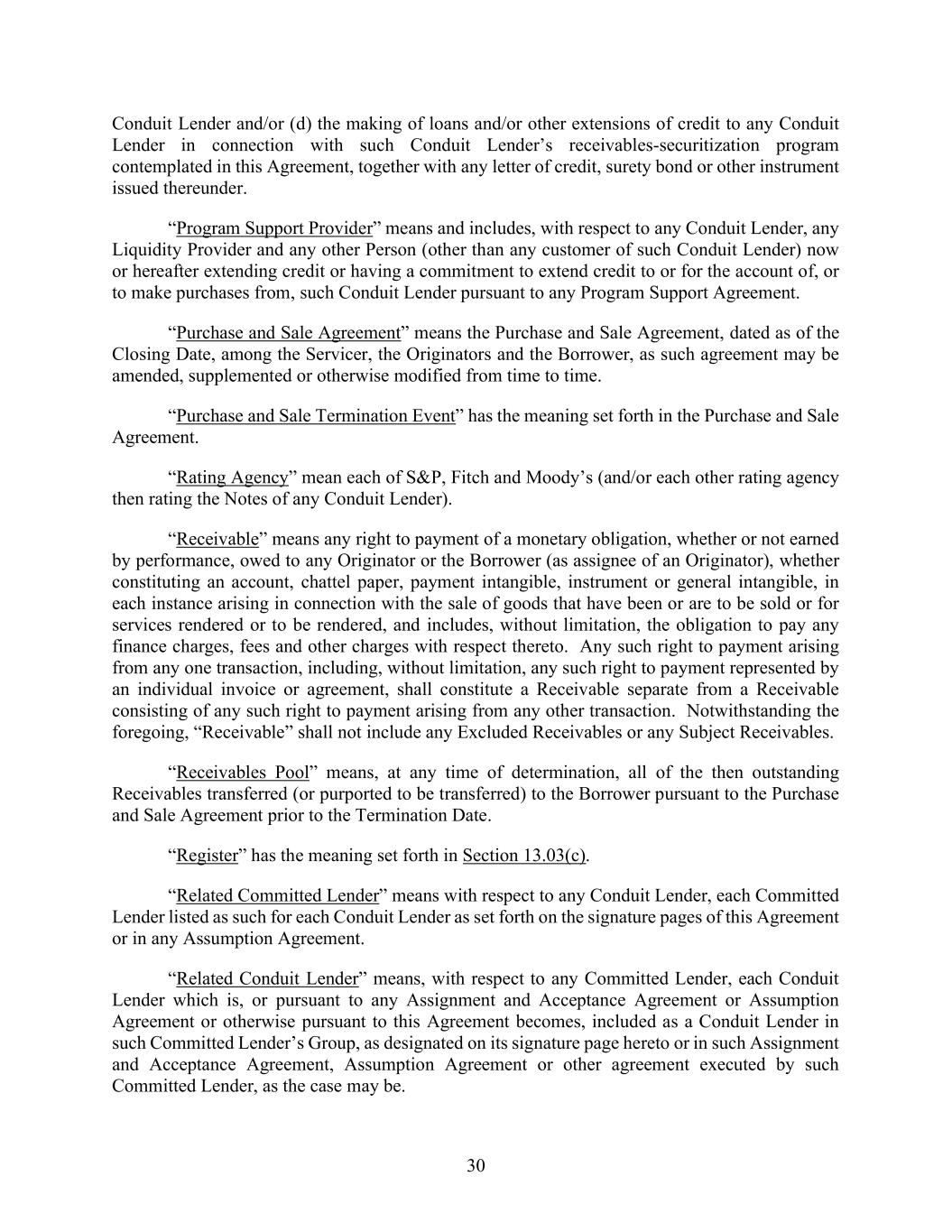 30 Conduit Lender and/or (d) the making of loans and/or other extensions of credit to any Conduit Lender in connection with such Conduit Lender’s receivables-securitization program contemplated in this Agreement, together with any letter of credit, surety bond or other instrument issued thereunder. “Program Support Provider” means and includes, with respect to any Conduit Lender, any Liquidity Provider and any other Person (other than any customer of such Conduit Lender) now or hereafter extending credit or having a commitment to extend credit to or for the account of, or to make purchases from, such Conduit Lender pursuant to any Program Support Agreement. “Purchase and Sale Agreement” means the Purchase and Sale Agreement, dated as of the Closing Date, among the Servicer, the Originators and the Borrower, as such agreement may be amended, supplemented or otherwise modified from time to time. “Purchase and Sale Termination Event” has the meaning set forth in the Purchase and Sale Agreement. “Rating Agency” mean each of S&P, Fitch and Moody’s (and/or each other rating agency then rating the Notes of any Conduit Lender). “Receivable” means any right to payment of a monetary obligation, whether or not earned by performance, owed to any Originator or the Borrower (as assignee of an Originator), whether constituting an account, chattel paper, payment intangible, instrument or general intangible, in each instance arising in connection with the sale of goods that have been or are to be sold or for services rendered or to be rendered, and includes, without limitation, the obligation to pay any finance charges, fees and other charges with respect thereto. Any such right to payment arising from any one transaction, including, without limitation, any such right to payment represented by an individual invoice or agreement, shall constitute a Receivable separate from a Receivable consisting of any such right to payment arising from any other transaction. Notwithstanding the foregoing, “Receivable” shall not include any Excluded Receivables or any Subject Receivables. “Receivables Pool” means, at any time of determination, all of the then outstanding Receivables transferred (or purported to be transferred) to the Borrower pursuant to the Purchase and Sale Agreement prior to the Termination Date. “Register” has the meaning set forth in Section 13.03(c). “Related Committed Lender” means with respect to any Conduit Lender, each Committed Lender listed as such for each Conduit Lender as set forth on the signature pages of this Agreement or in any Assumption Agreement. “Related Conduit Lender” means, with respect to any Committed Lender, each Conduit Lender which is, or pursuant to any Assignment and Acceptance Agreement or Assumption Agreement or otherwise pursuant to this Agreement becomes, included as a Conduit Lender in such Committed Lender’s Group, as designated on its signature page hereto or in such Assignment and Acceptance Agreement, Assumption Agreement or other agreement executed by such Committed Lender, as the case may be.