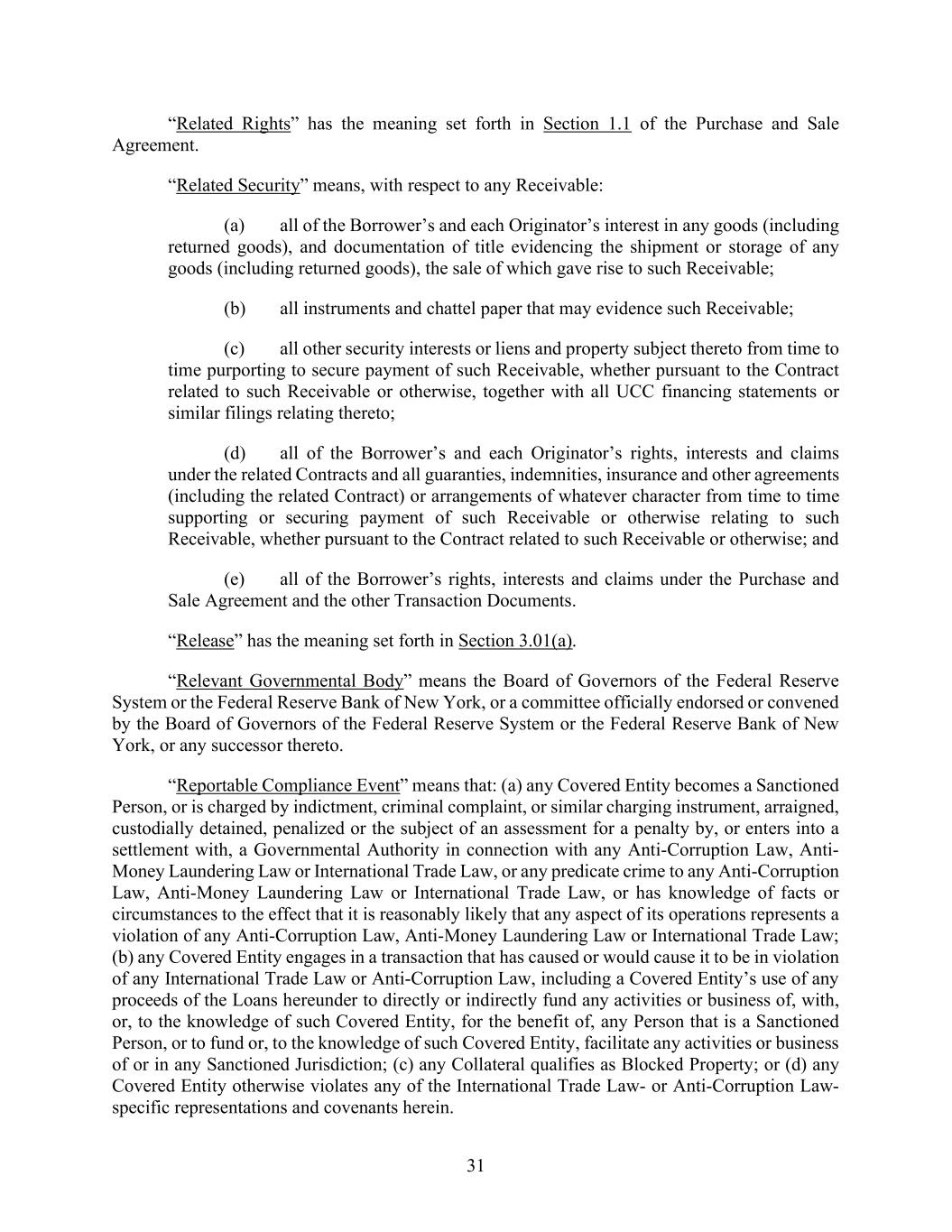 31 “Related Rights” has the meaning set forth in Section 1.1 of the Purchase and Sale Agreement. “Related Security” means, with respect to any Receivable: (a) all of the Borrower’s and each Originator’s interest in any goods (including returned goods), and documentation of title evidencing the shipment or storage of any goods (including returned goods), the sale of which gave rise to such Receivable; (b) all instruments and chattel paper that may evidence such Receivable; (c) all other security interests or liens and property subject thereto from time to time purporting to secure payment of such Receivable, whether pursuant to the Contract related to such Receivable or otherwise, together with all UCC financing statements or similar filings relating thereto; (d) all of the Borrower’s and each Originator’s rights, interests and claims under the related Contracts and all guaranties, indemnities, insurance and other agreements (including the related Contract) or arrangements of whatever character from time to time supporting or securing payment of such Receivable or otherwise relating to such Receivable, whether pursuant to the Contract related to such Receivable or otherwise; and (e) all of the Borrower’s rights, interests and claims under the Purchase and Sale Agreement and the other Transaction Documents. “Release” has the meaning set forth in Section 3.01(a). “Relevant Governmental Body” means the Board of Governors of the Federal Reserve System or the Federal Reserve Bank of New York, or a committee officially endorsed or convened by the Board of Governors of the Federal Reserve System or the Federal Reserve Bank of New York, or any successor thereto. “Reportable Compliance Event” means that: (a) any Covered Entity becomes a Sanctioned Person, or is charged by indictment, criminal complaint, or similar charging instrument, arraigned, custodially detained, penalized or the subject of an assessment for a penalty by, or enters into a settlement with, a Governmental Authority in connection with any Anti-Corruption Law, Anti- Money Laundering Law or International Trade Law, or any predicate crime to any Anti-Corruption Law, Anti-Money Laundering Law or International Trade Law, or has knowledge of facts or circumstances to the effect that it is reasonably likely that any aspect of its operations represents a violation of any Anti-Corruption Law, Anti-Money Laundering Law or International Trade Law; (b) any Covered Entity engages in a transaction that has caused or would cause it to be in violation of any International Trade Law or Anti-Corruption Law, including a Covered Entity’s use of any proceeds of the Loans hereunder to directly or indirectly fund any activities or business of, with, or, to the knowledge of such Covered Entity, for the benefit of, any Person that is a Sanctioned Person, or to fund or, to the knowledge of such Covered Entity, facilitate any activities or business of or in any Sanctioned Jurisdiction; (c) any Collateral qualifies as Blocked Property; or (d) any Covered Entity otherwise violates any of the International Trade Law- or Anti-Corruption Law- specific representations and covenants herein.