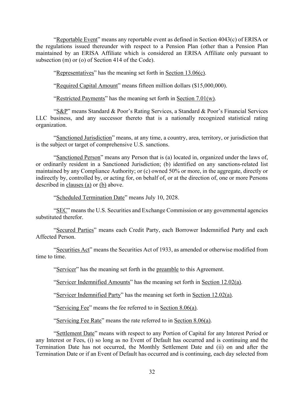 32 “Reportable Event” means any reportable event as defined in Section 4043(c) of ERISA or the regulations issued thereunder with respect to a Pension Plan (other than a Pension Plan maintained by an ERISA Affiliate which is considered an ERISA Affiliate only pursuant to subsection (m) or (o) of Section 414 of the Code). “Representatives” has the meaning set forth in Section 13.06(c). “Required Capital Amount” means fifteen million dollars ($15,000,000). “Restricted Payments” has the meaning set forth in Section 7.01(w). “S&P” means Standard & Poor’s Rating Services, a Standard & Poor’s Financial Services LLC business, and any successor thereto that is a nationally recognized statistical rating organization. “Sanctioned Jurisdiction” means, at any time, a country, area, territory, or jurisdiction that is the subject or target of comprehensive U.S. sanctions. “Sanctioned Person” means any Person that is (a) located in, organized under the laws of, or ordinarily resident in a Sanctioned Jurisdiction; (b) identified on any sanctions-related list maintained by any Compliance Authority; or (c) owned 50% or more, in the aggregate, directly or indirectly by, controlled by, or acting for, on behalf of, or at the direction of, one or more Persons described in clauses (a) or (b) above. “Scheduled Termination Date” means July 10, 2028. “SEC” means the U.S. Securities and Exchange Commission or any governmental agencies substituted therefor. “Secured Parties” means each Credit Party, each Borrower Indemnified Party and each Affected Person. “Securities Act” means the Securities Act of 1933, as amended or otherwise modified from time to time. “Servicer” has the meaning set forth in the preamble to this Agreement. “Servicer Indemnified Amounts” has the meaning set forth in Section 12.02(a). “Servicer Indemnified Party” has the meaning set forth in Section 12.02(a). “Servicing Fee” means the fee referred to in Section 8.06(a). “Servicing Fee Rate” means the rate referred to in Section 8.06(a). “Settlement Date” means with respect to any Portion of Capital for any Interest Period or any Interest or Fees, (i) so long as no Event of Default has occurred and is continuing and the Termination Date has not occurred, the Monthly Settlement Date and (ii) on and after the Termination Date or if an Event of Default has occurred and is continuing, each day selected from