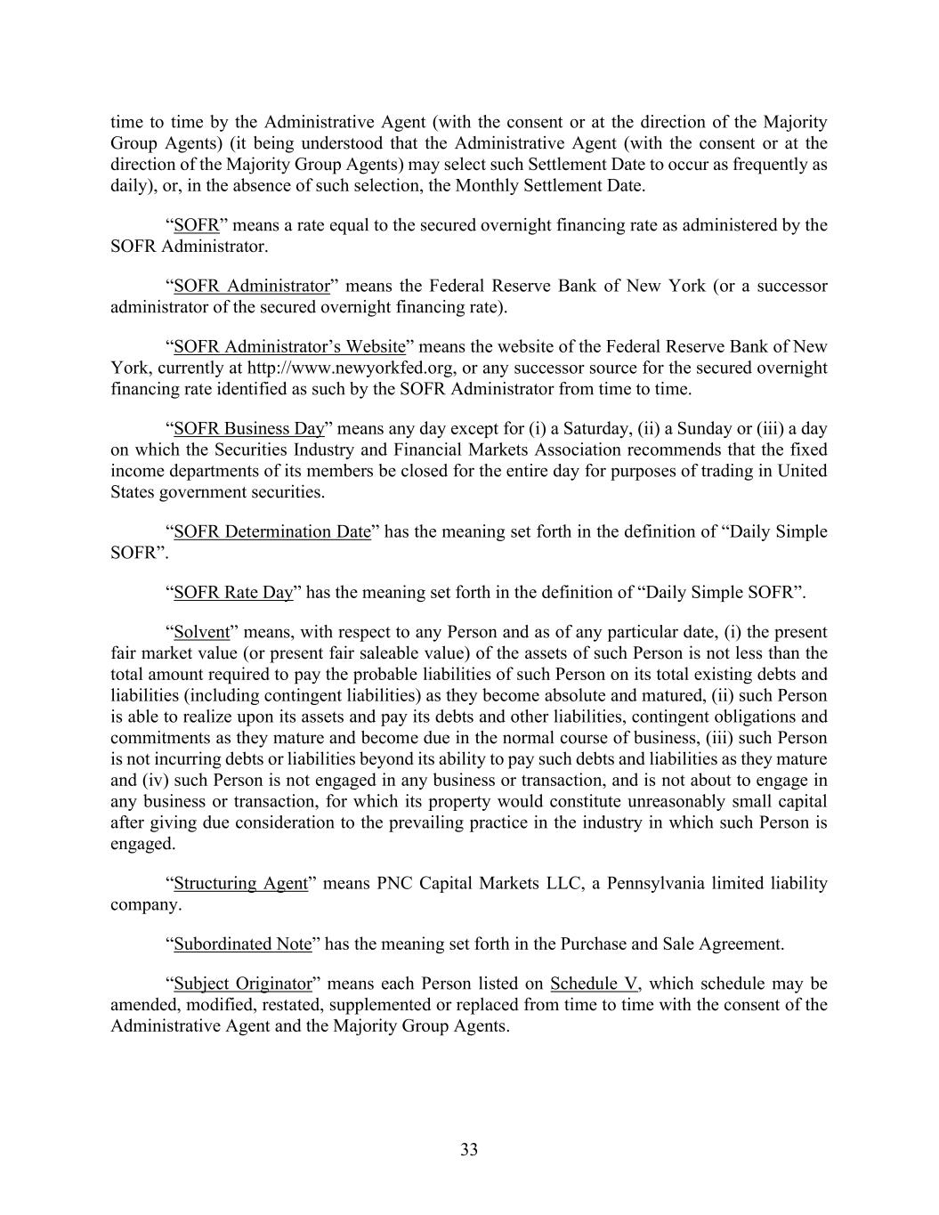 33 time to time by the Administrative Agent (with the consent or at the direction of the Majority Group Agents) (it being understood that the Administrative Agent (with the consent or at the direction of the Majority Group Agents) may select such Settlement Date to occur as frequently as daily), or, in the absence of such selection, the Monthly Settlement Date. “SOFR” means a rate equal to the secured overnight financing rate as administered by the SOFR Administrator. “SOFR Administrator” means the Federal Reserve Bank of New York (or a successor administrator of the secured overnight financing rate). “SOFR Administrator’s Website” means the website of the Federal Reserve Bank of New York, currently at http://www.newyorkfed.org, or any successor source for the secured overnight financing rate identified as such by the SOFR Administrator from time to time. “SOFR Business Day” means any day except for (i) a Saturday, (ii) a Sunday or (iii) a day on which the Securities Industry and Financial Markets Association recommends that the fixed income departments of its members be closed for the entire day for purposes of trading in United States government securities. “SOFR Determination Date” has the meaning set forth in the definition of “Daily Simple SOFR”. “SOFR Rate Day” has the meaning set forth in the definition of “Daily Simple SOFR”. “Solvent” means, with respect to any Person and as of any particular date, (i) the present fair market value (or present fair saleable value) of the assets of such Person is not less than the total amount required to pay the probable liabilities of such Person on its total existing debts and liabilities (including contingent liabilities) as they become absolute and matured, (ii) such Person is able to realize upon its assets and pay its debts and other liabilities, contingent obligations and commitments as they mature and become due in the normal course of business, (iii) such Person is not incurring debts or liabilities beyond its ability to pay such debts and liabilities as they mature and (iv) such Person is not engaged in any business or transaction, and is not about to engage in any business or transaction, for which its property would constitute unreasonably small capital after giving due consideration to the prevailing practice in the industry in which such Person is engaged. “Structuring Agent” means PNC Capital Markets LLC, a Pennsylvania limited liability company. “Subordinated Note” has the meaning set forth in the Purchase and Sale Agreement. “Subject Originator” means each Person listed on Schedule V, which schedule may be amended, modified, restated, supplemented or replaced from time to time with the consent of the Administrative Agent and the Majority Group Agents.