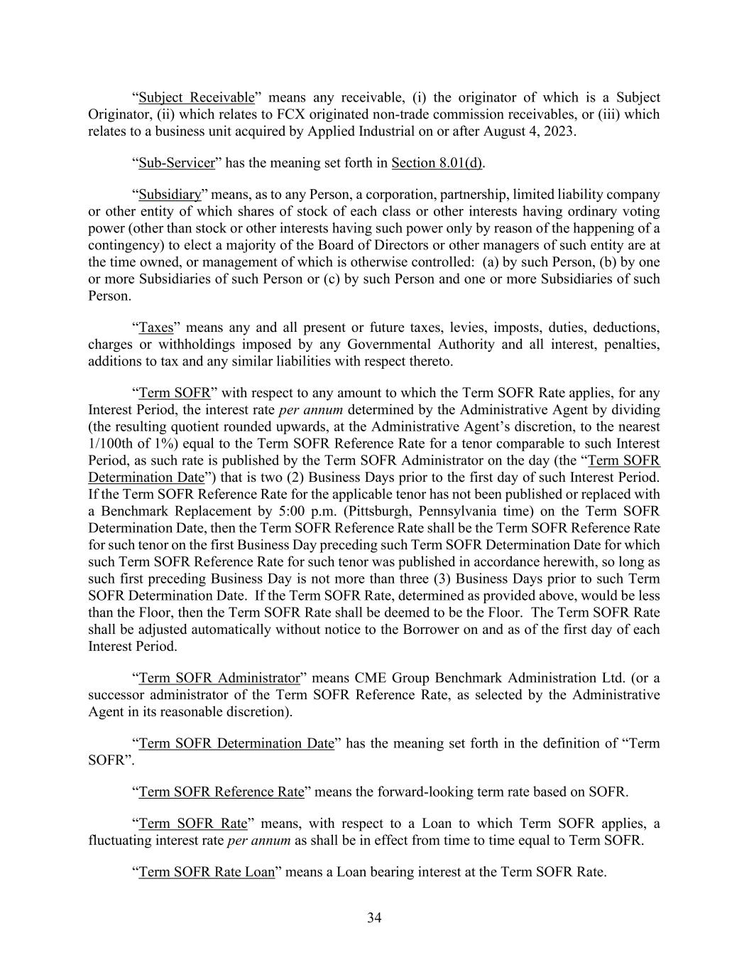 34 “Subject Receivable” means any receivable, (i) the originator of which is a Subject Originator, (ii) which relates to FCX originated non-trade commission receivables, or (iii) which relates to a business unit acquired by Applied Industrial on or after August 4, 2023. “Sub-Servicer” has the meaning set forth in Section 8.01(d). “Subsidiary” means, as to any Person, a corporation, partnership, limited liability company or other entity of which shares of stock of each class or other interests having ordinary voting power (other than stock or other interests having such power only by reason of the happening of a contingency) to elect a majority of the Board of Directors or other managers of such entity are at the time owned, or management of which is otherwise controlled: (a) by such Person, (b) by one or more Subsidiaries of such Person or (c) by such Person and one or more Subsidiaries of such Person. “Taxes” means any and all present or future taxes, levies, imposts, duties, deductions, charges or withholdings imposed by any Governmental Authority and all interest, penalties, additions to tax and any similar liabilities with respect thereto. “Term SOFR” with respect to any amount to which the Term SOFR Rate applies, for any Interest Period, the interest rate per annum determined by the Administrative Agent by dividing (the resulting quotient rounded upwards, at the Administrative Agent’s discretion, to the nearest 1/100th of 1%) equal to the Term SOFR Reference Rate for a tenor comparable to such Interest Period, as such rate is published by the Term SOFR Administrator on the day (the “Term SOFR Determination Date”) that is two (2) Business Days prior to the first day of such Interest Period. If the Term SOFR Reference Rate for the applicable tenor has not been published or replaced with a Benchmark Replacement by 5:00 p.m. (Pittsburgh, Pennsylvania time) on the Term SOFR Determination Date, then the Term SOFR Reference Rate shall be the Term SOFR Reference Rate for such tenor on the first Business Day preceding such Term SOFR Determination Date for which such Term SOFR Reference Rate for such tenor was published in accordance herewith, so long as such first preceding Business Day is not more than three (3) Business Days prior to such Term SOFR Determination Date. If the Term SOFR Rate, determined as provided above, would be less than the Floor, then the Term SOFR Rate shall be deemed to be the Floor. The Term SOFR Rate shall be adjusted automatically without notice to the Borrower on and as of the first day of each Interest Period. “Term SOFR Administrator” means CME Group Benchmark Administration Ltd. (or a successor administrator of the Term SOFR Reference Rate, as selected by the Administrative Agent in its reasonable discretion). “Term SOFR Determination Date” has the meaning set forth in the definition of “Term SOFR”. “Term SOFR Reference Rate” means the forward-looking term rate based on SOFR. “Term SOFR Rate” means, with respect to a Loan to which Term SOFR applies, a fluctuating interest rate per annum as shall be in effect from time to time equal to Term SOFR. “Term SOFR Rate Loan” means a Loan bearing interest at the Term SOFR Rate.